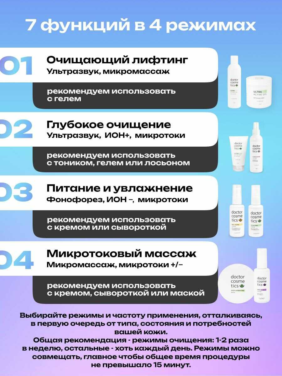 | Принцип работы : | RF-лифтинг, вибрация, ионизация, микротоки, пилинг, светотерапия, ультразвук, фонофорез |