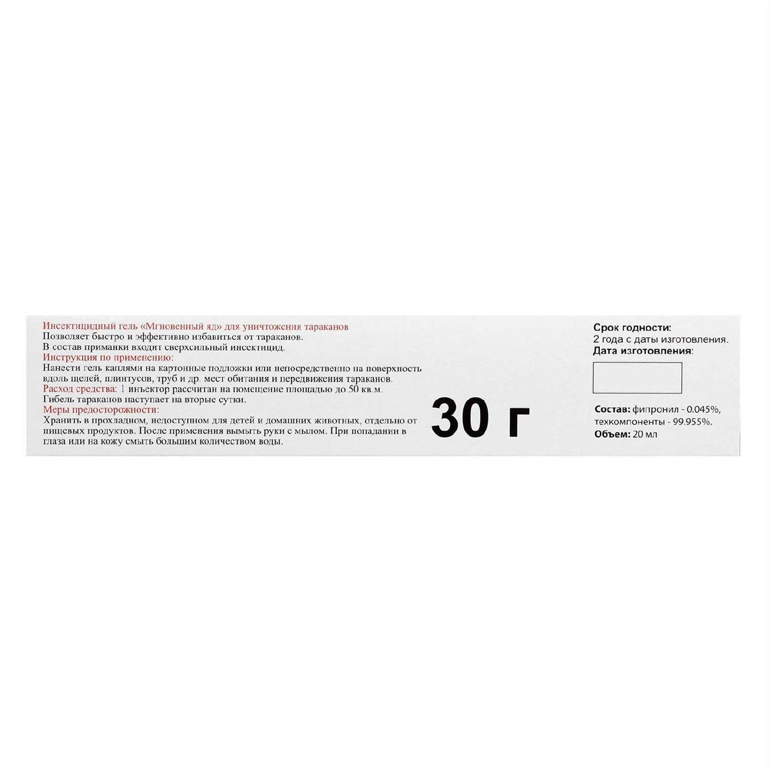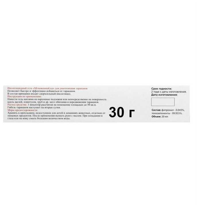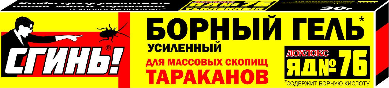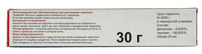 Дополнительная информация : | Борный гель от тараканов является токсичным, поэтому требует осторожности при нанесении. Не допускайте попадания вещества на кожный покров или слизистые (глаза, рот), гель может вызывать раздражение, покраснение, отек. В случае попадания обильно промойте пораженное место под водой. После обработки тщательно мойте руки с мылом. Не наносите гель в местах, доступных для детей или животных. При попадании внутрь организма он может вызвать сильное отравление. Храните борный гель в сухом темной месте, отдельно от пищевых продуктов и медикаментов. Не допускайте контакта с детьми и домашними питомцами. Использованную упаковку утилизируйте как бытовые отходы. Если тараканов мало, они появились недавно 1 упаковки хватит на 60 кв. метров Если тараканов мало, они появились давно 1 упаковки хватит на 40 кв. метров Если тараканов много, они появились недавно 1 упаковки хватит на 15 кв. метра Если тараканов много, они появились давно 1 упаковки хватит на 10 кв. метра |