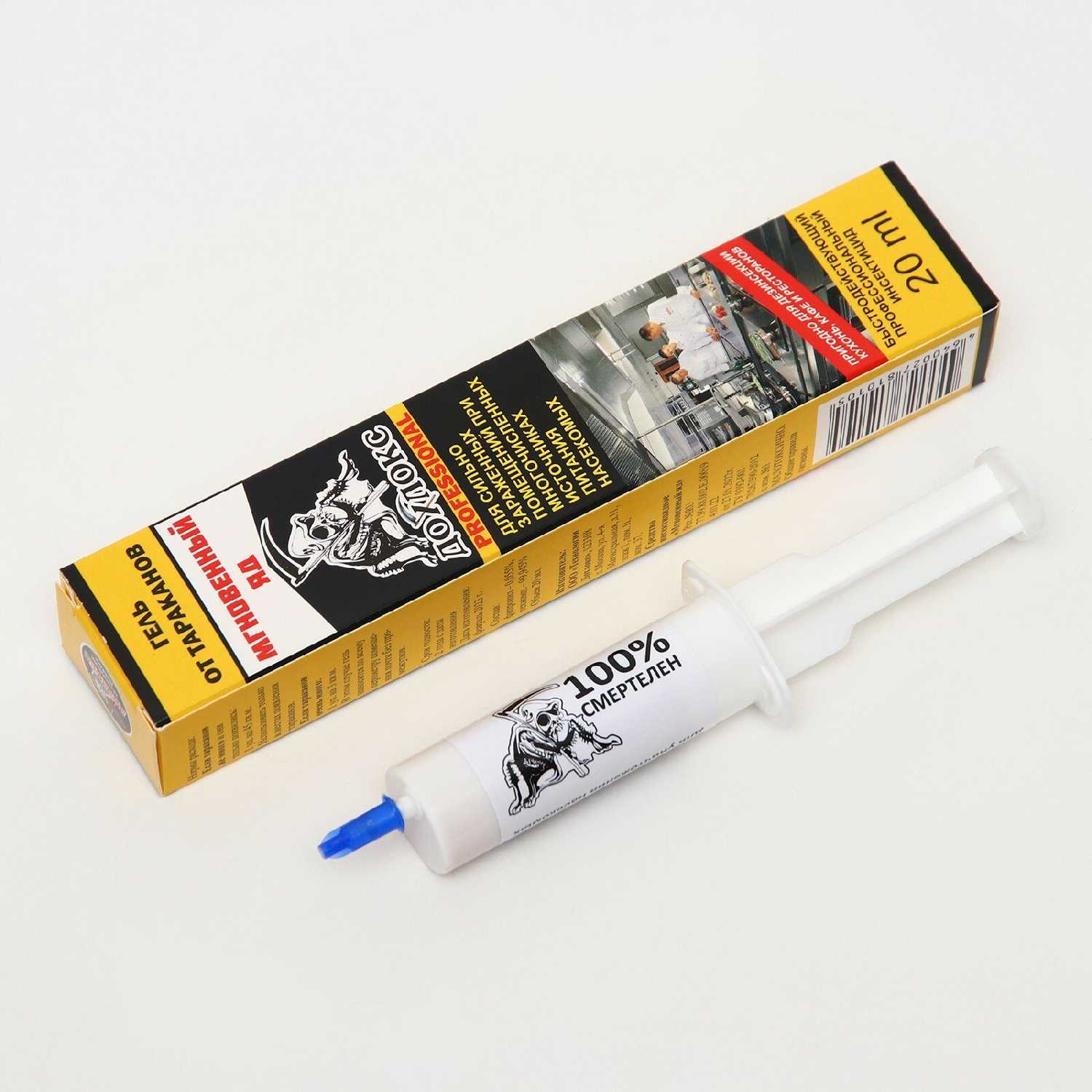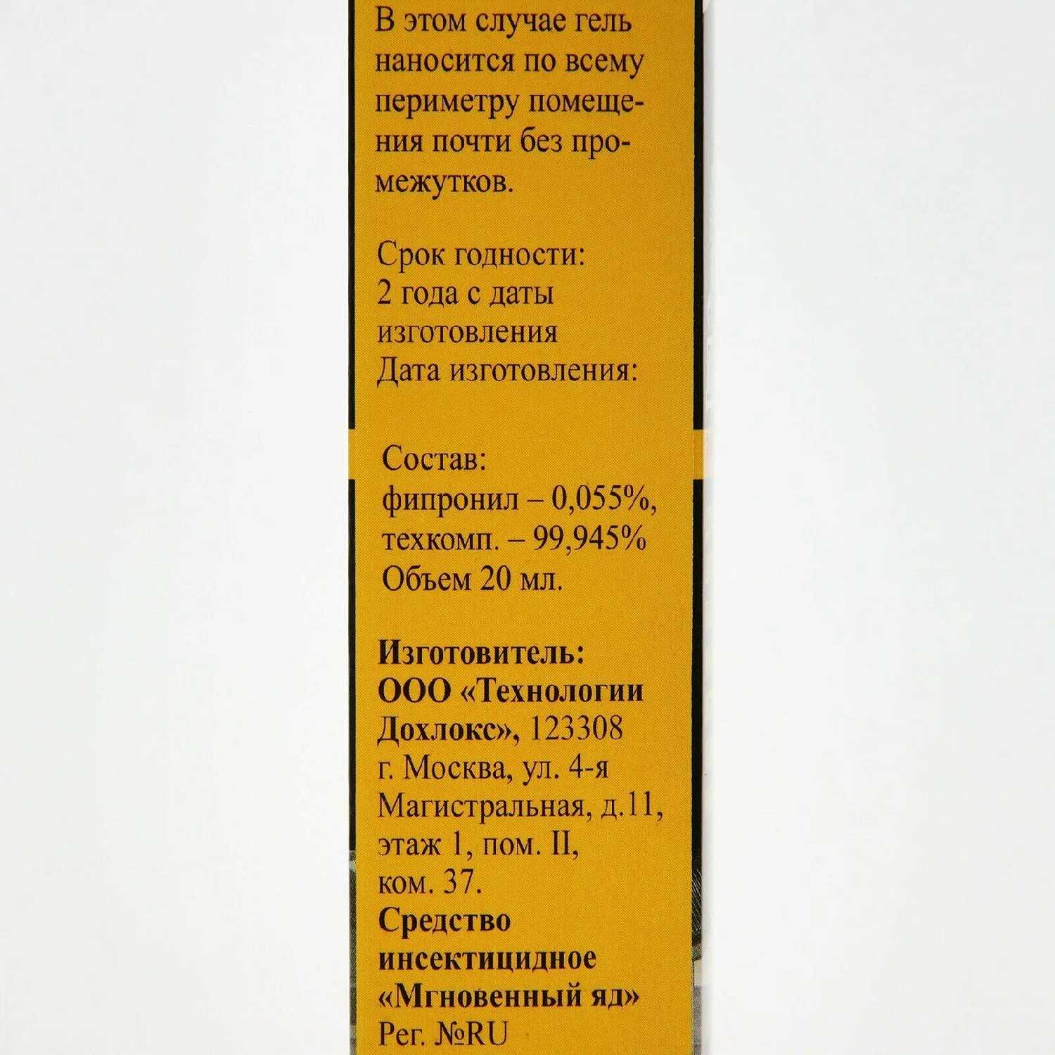 | Способ применения : | аккуратно выдавливать гель распределяя его небольшими полосками по периметру помещения: вдоль плинтусов стен щелей, особое внимание уделить обработке вентиляционных отверстий, нанести побольше средства на пол под мойками батареями отопления кухонными шкафами и в санузлах |