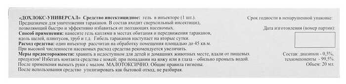 Способ применения : | В зависимости от того, сколько завелось насекомых в помещениях Вам может потребоваться различное количество геля на единицу площади (от одного шприца на 45 м² и до 20 мл на 3 м²). Более подробную информацию об этом Вы сможете найти на упаковке. Там же расположена инструкция по применению данного средства и меры безопасности при его использовании. |