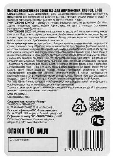 | Способ применения : | Для приготовления рабочего раствора препарат следует развести водой в пропорциях 10 мл на 1 литр воды и тщательно перемешать. Обработать готовым раствором места их возможного обитания: заднюю поверхность ковров, мебели, кроватей, щели в плинтусах (постельные принадлежности не обрабатывать) |