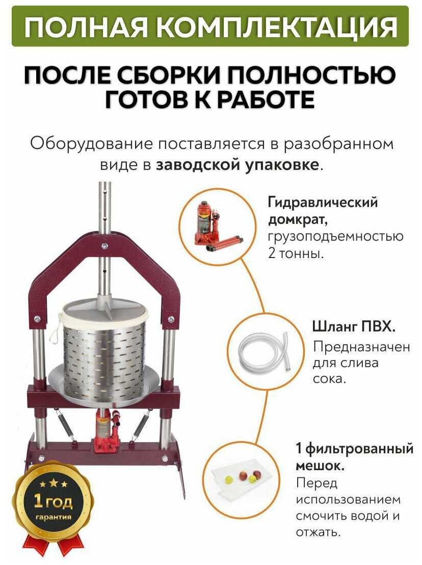 | Дополнительная информация : | гидравлический домкрат: давление составляет 3.7 килограмм на квадратный сантиметр максимальная грузоподъемность - 2 тонны, фильтровальный мешок из бязи перед использованием мешок необходимо смочить водой и отжать, габаритные размеры: 899*529*420 мм общий вес: 19 кг производительность: 1 литр сока в минуту, нержавеющая сталь - AISI 430, сливной носик: длина - 35 мм диаметр - 16 мм |