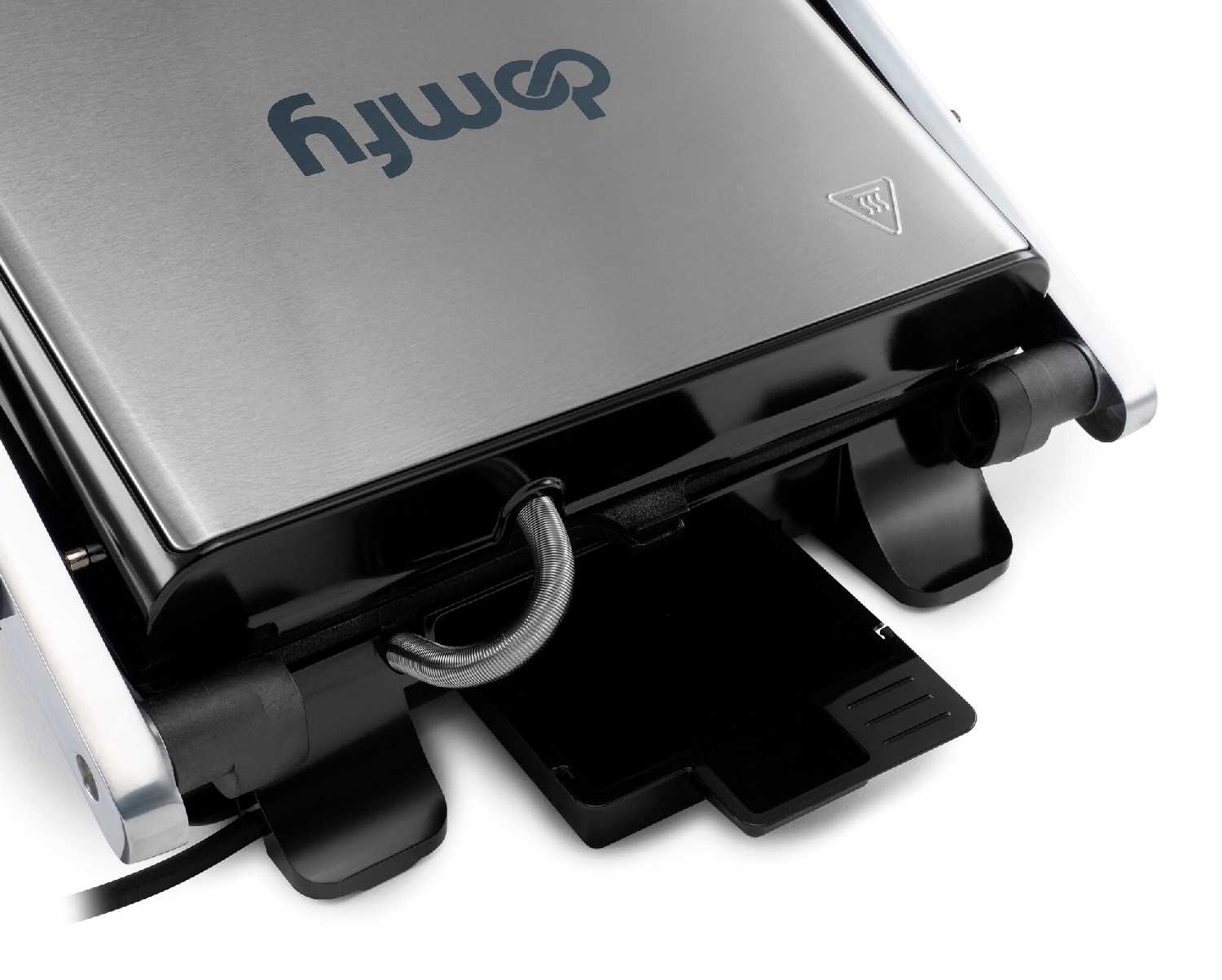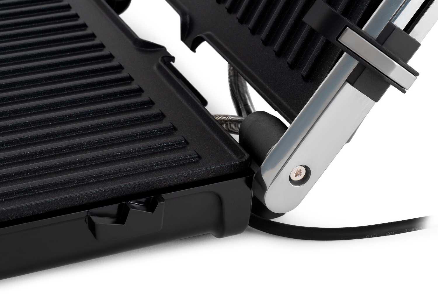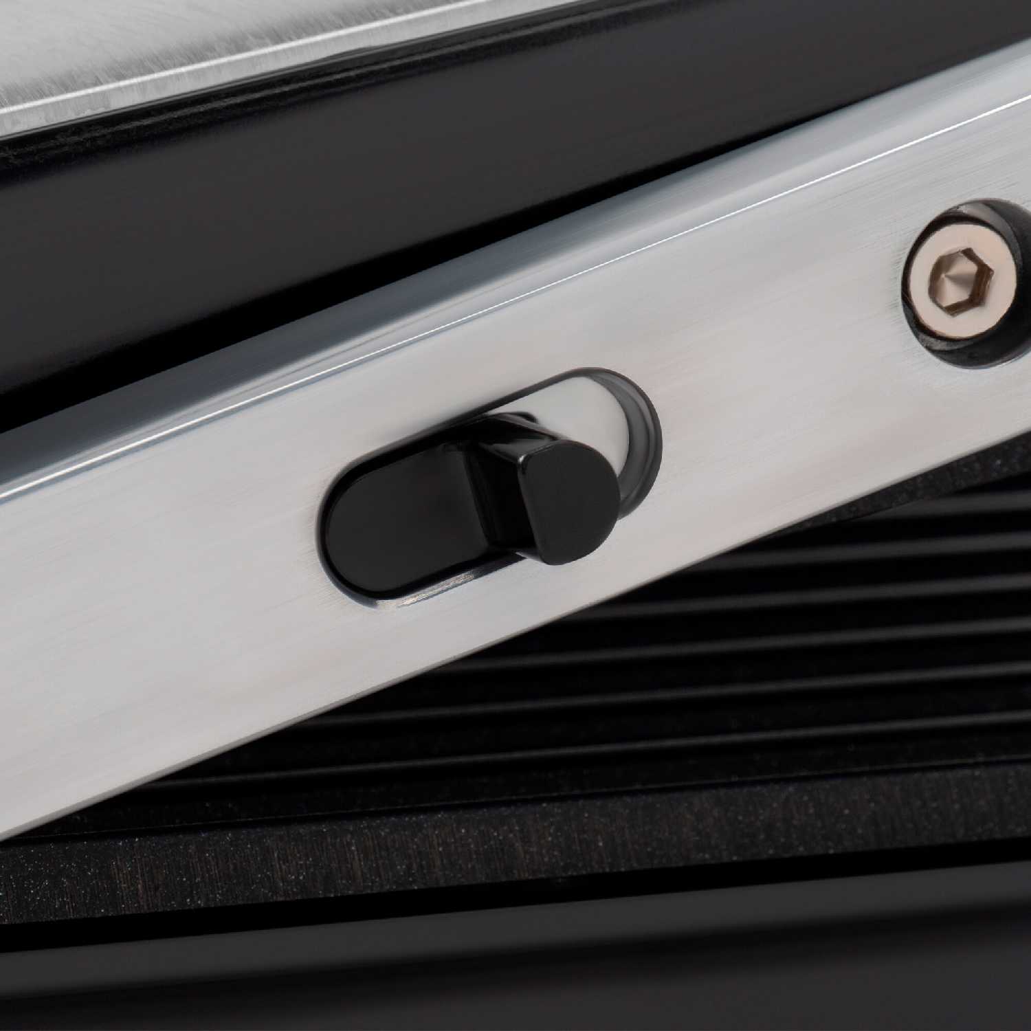 Верхняя крышка автоматически подстраивается под высоту продукта, обеспечивая равномерный прижим без необходимости ручной регулировки. Это особенно удобно для продуктов разной толщины, таких как бургеры или куски мяса. При желании крышку можно зафиксировать в нужном положении вручную. Механизм работает плавно и надежно. -
