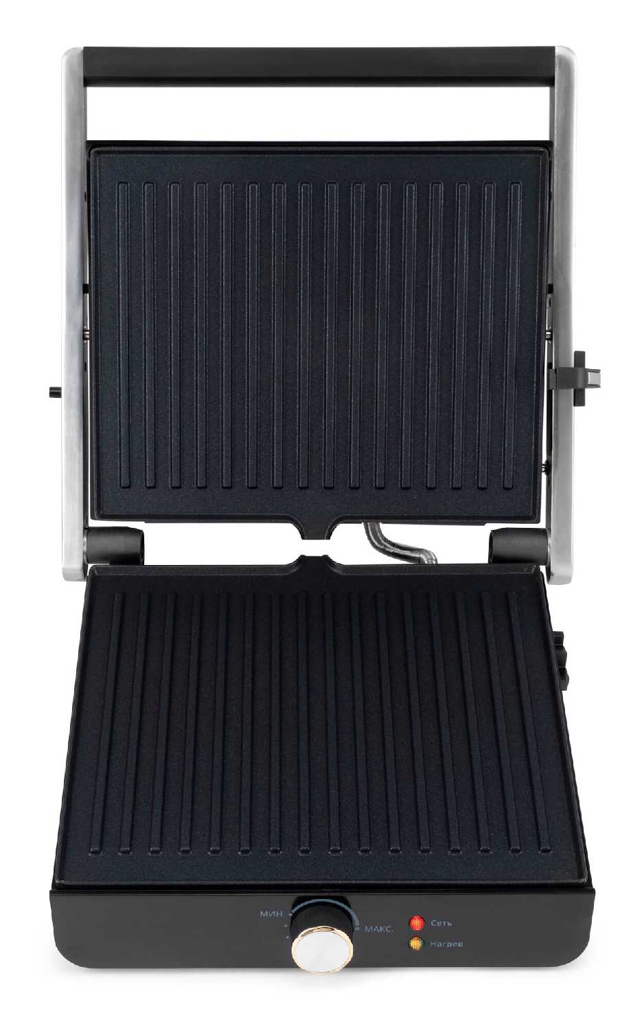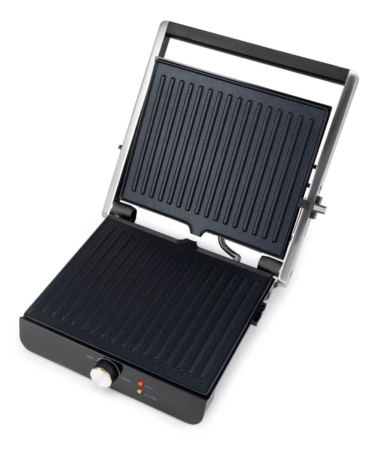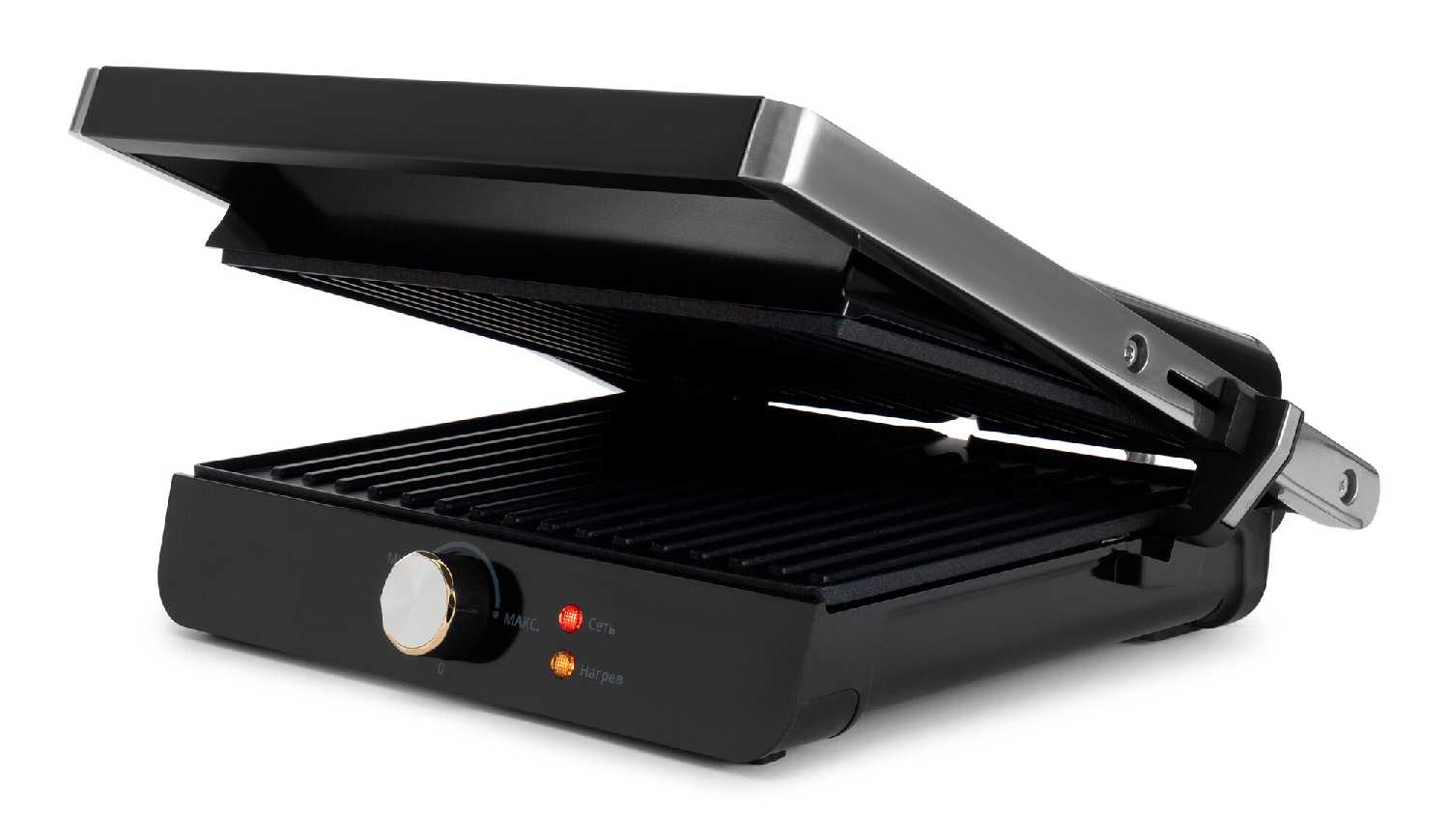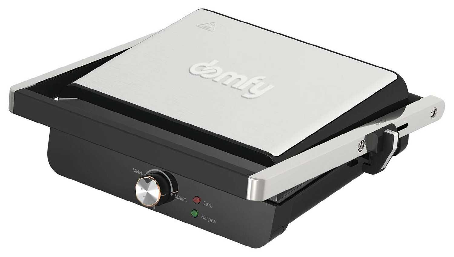 - Механизм самостоятельно регулирует высоту, обеспечивая равномерный прижим и прогрев продуктов разной толщины.