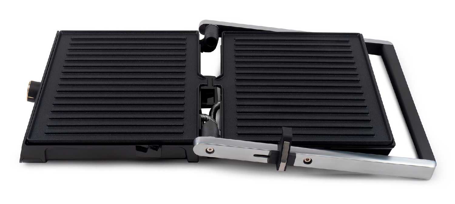 - Режим барбекю с раскрытием на 180° позволяет использовать устройство как две независимые жарочные поверхности.
