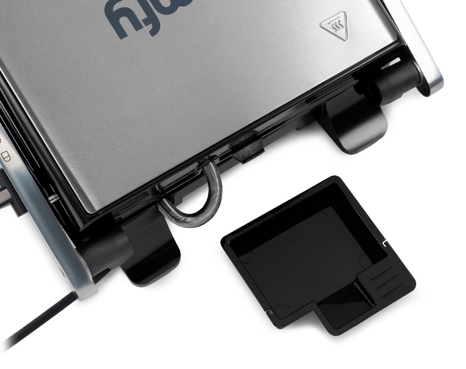 - Специальный желоб и съемный лоток эффективно собирают стекающий жир, предотвращая его разбрызгивание и облегчая уход.