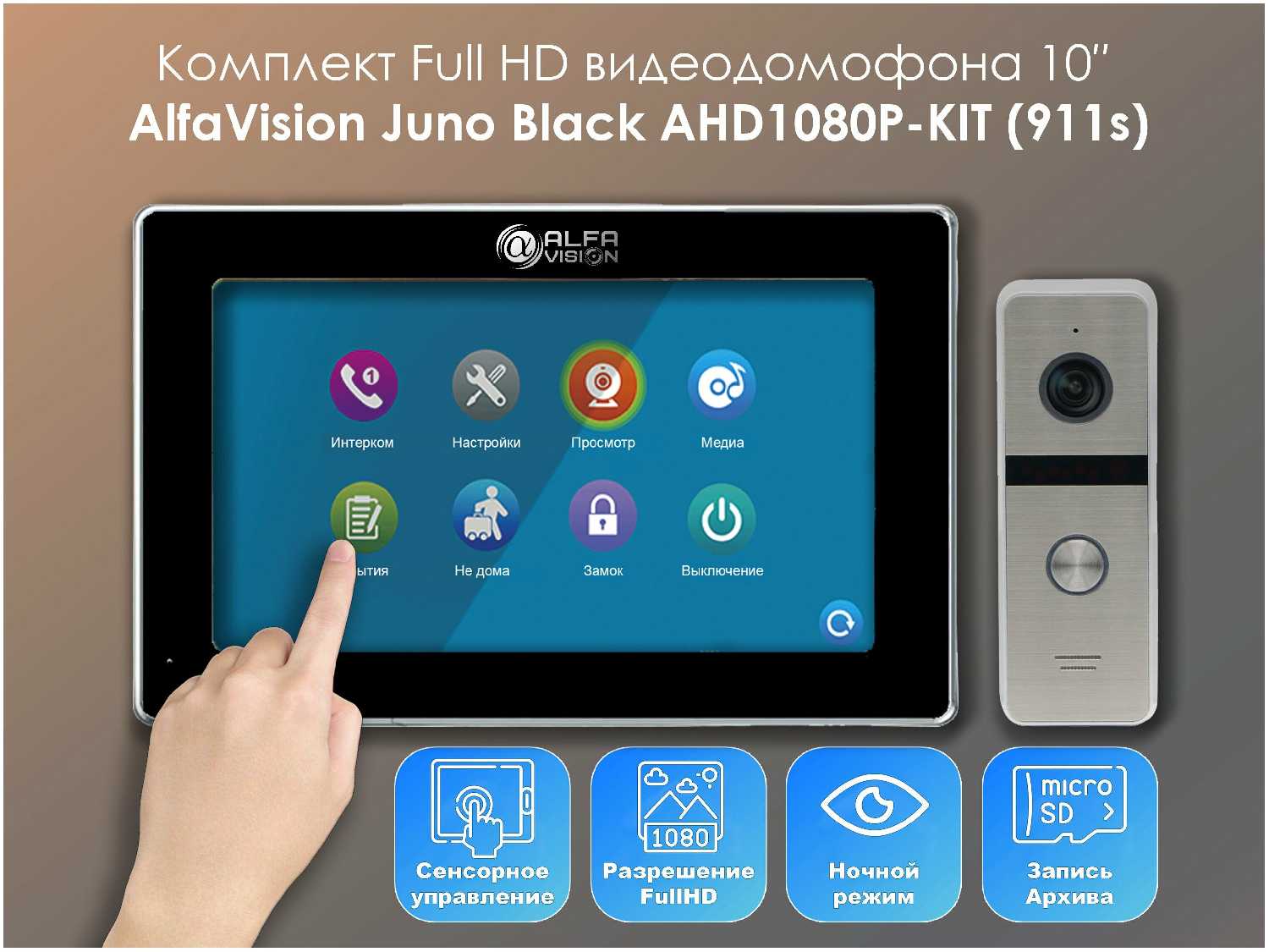 AlfaVision Комплект видеодомофона Juno Black-KIT Wi-Fi (911s) Full HD, 10 дюймов /в квартиру /домофон в подъезд / видеодомофон для частного дома205 место из 699 Характеристики:- исполнение: полный набор