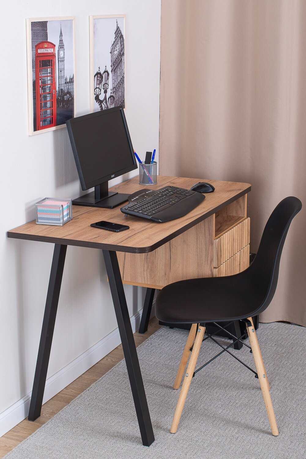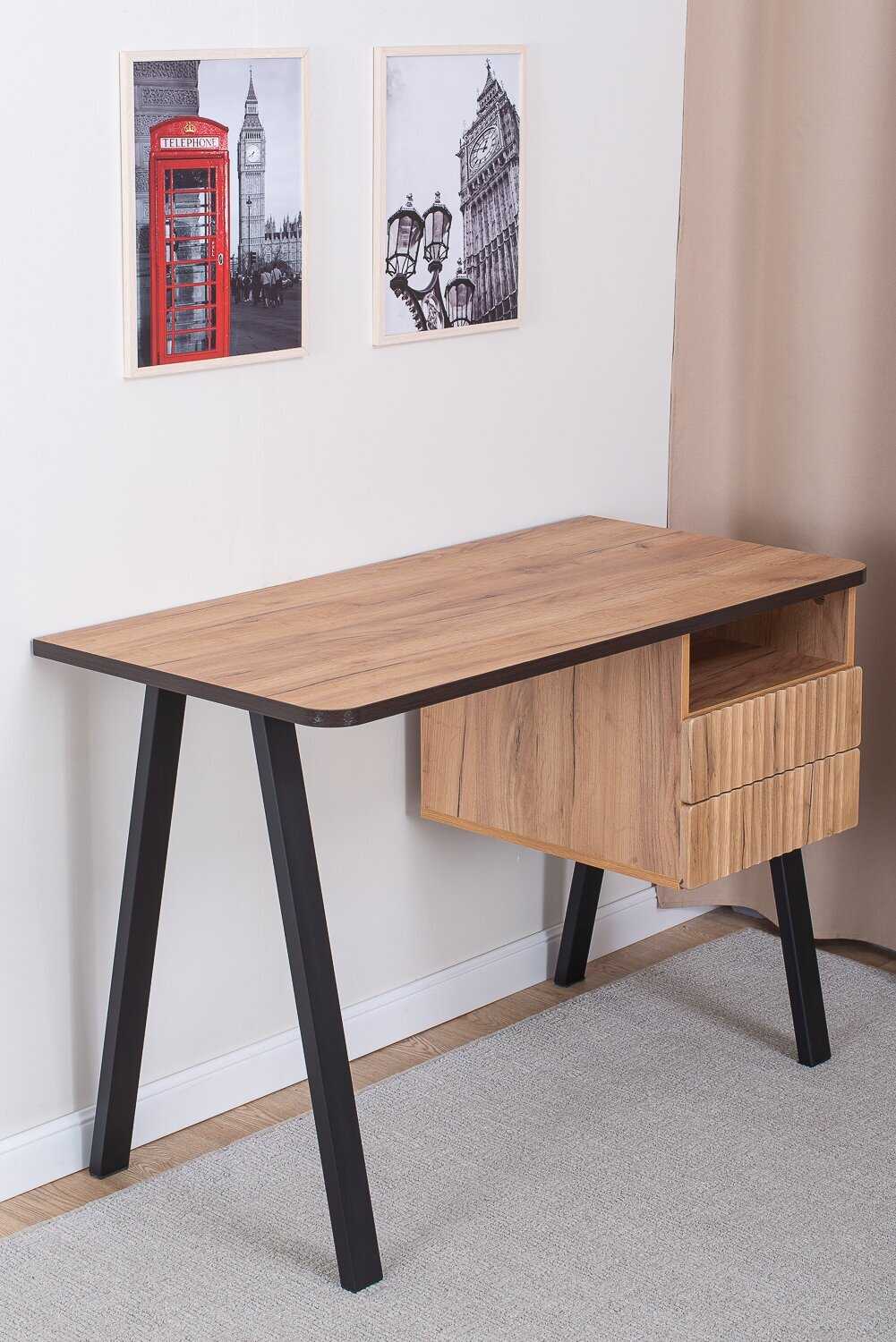 - Столешница и каркас изготовлены из плотных, устойчивых к нагрузкам материалов, что обеспечивает долговечность и надежность конструкции.
