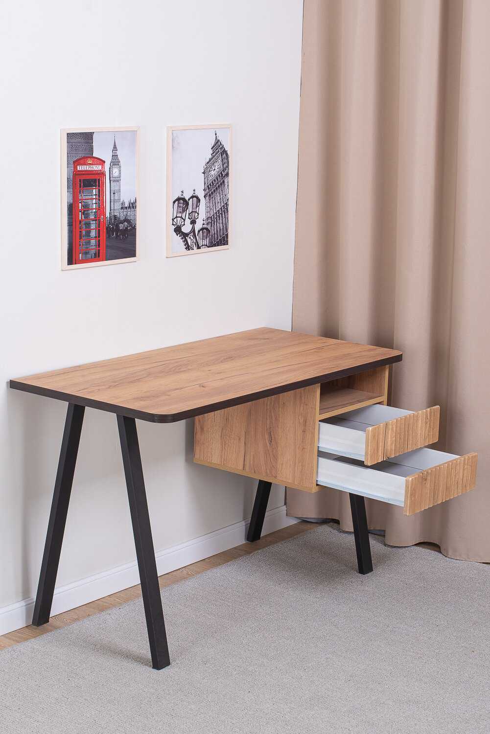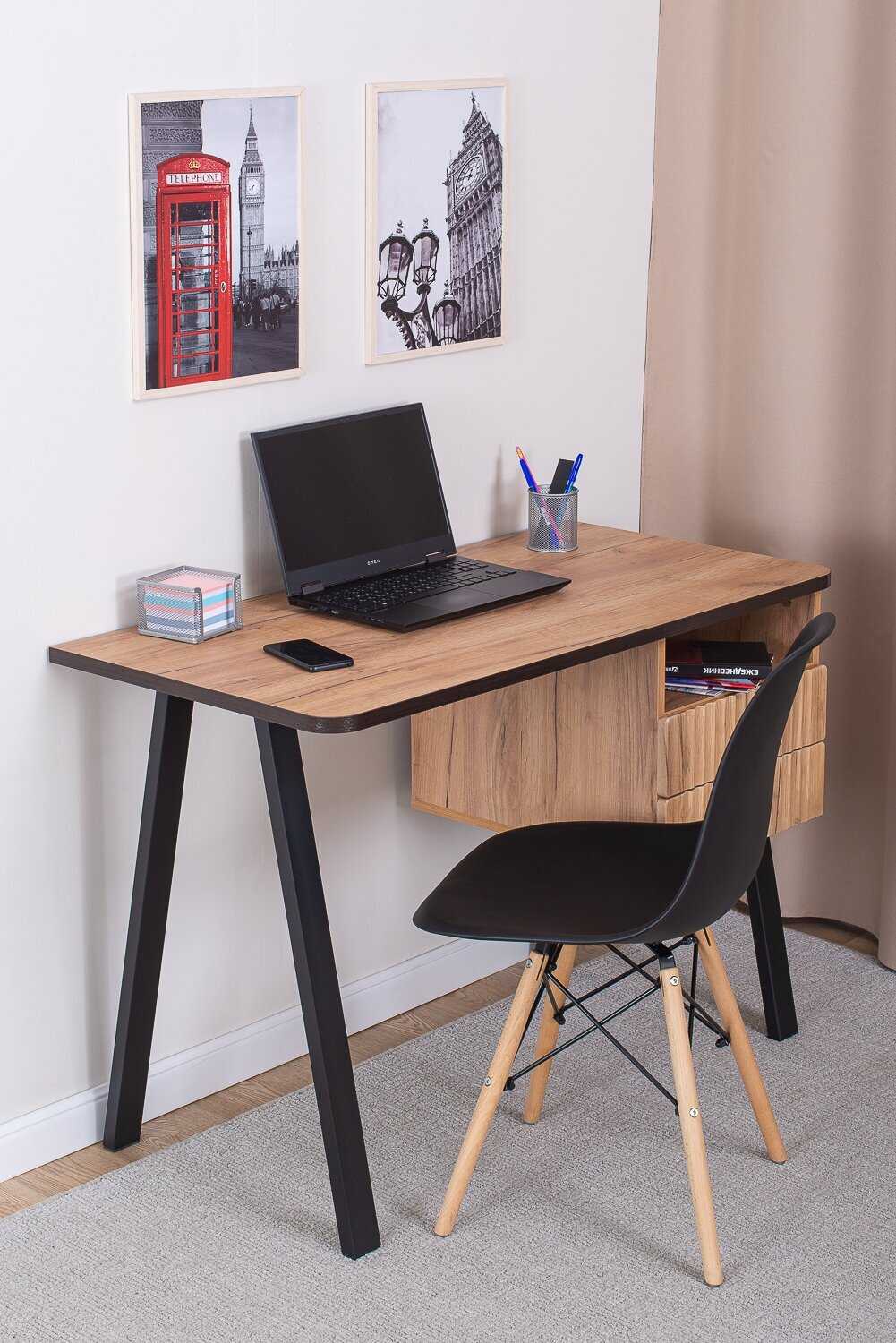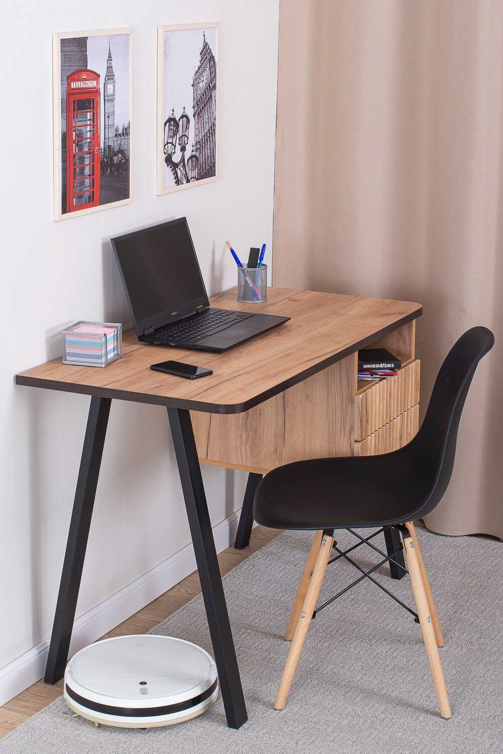 - Столешница и каркас изготовлены из плотных, устойчивых к нагрузкам материалов, что обеспечивает долговечность и надежность конструкции.
