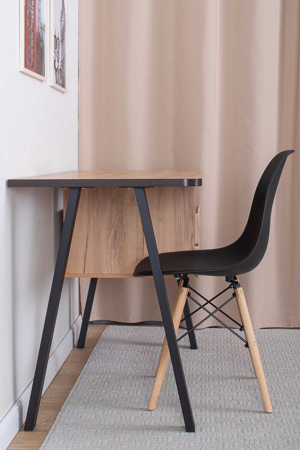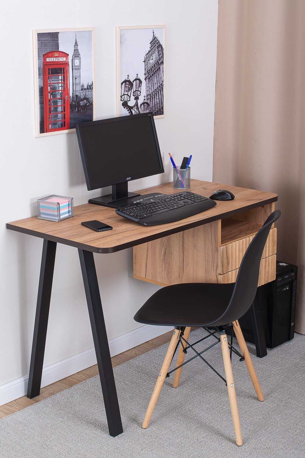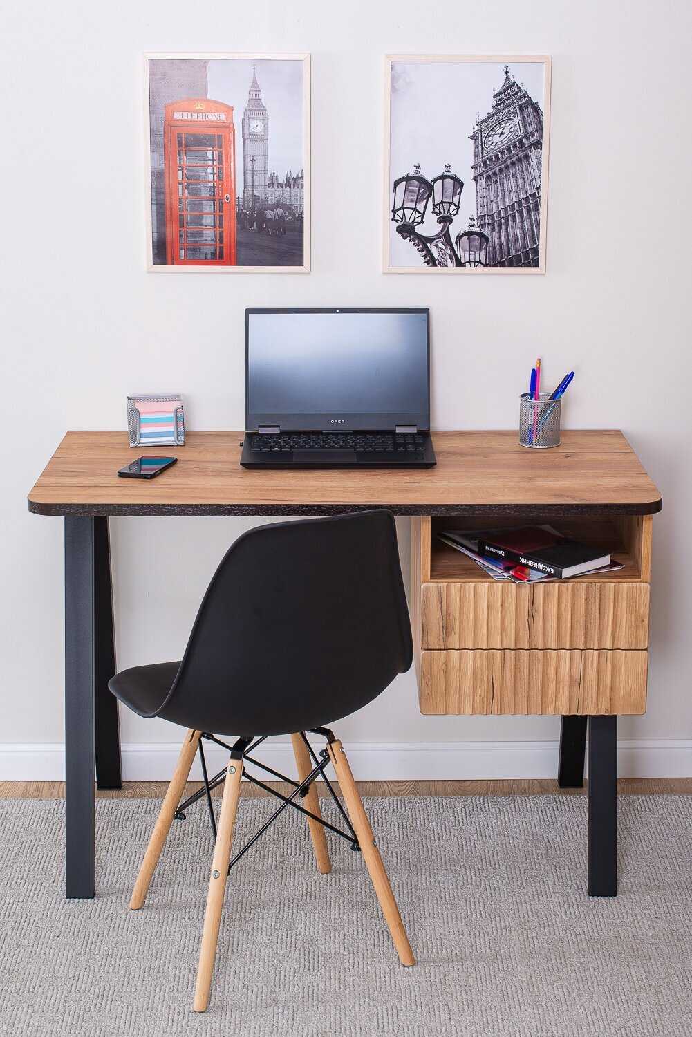 - Столешница и каркас изготовлены из плотных, устойчивых к нагрузкам материалов, что обеспечивает долговечность и надежность конструкции.