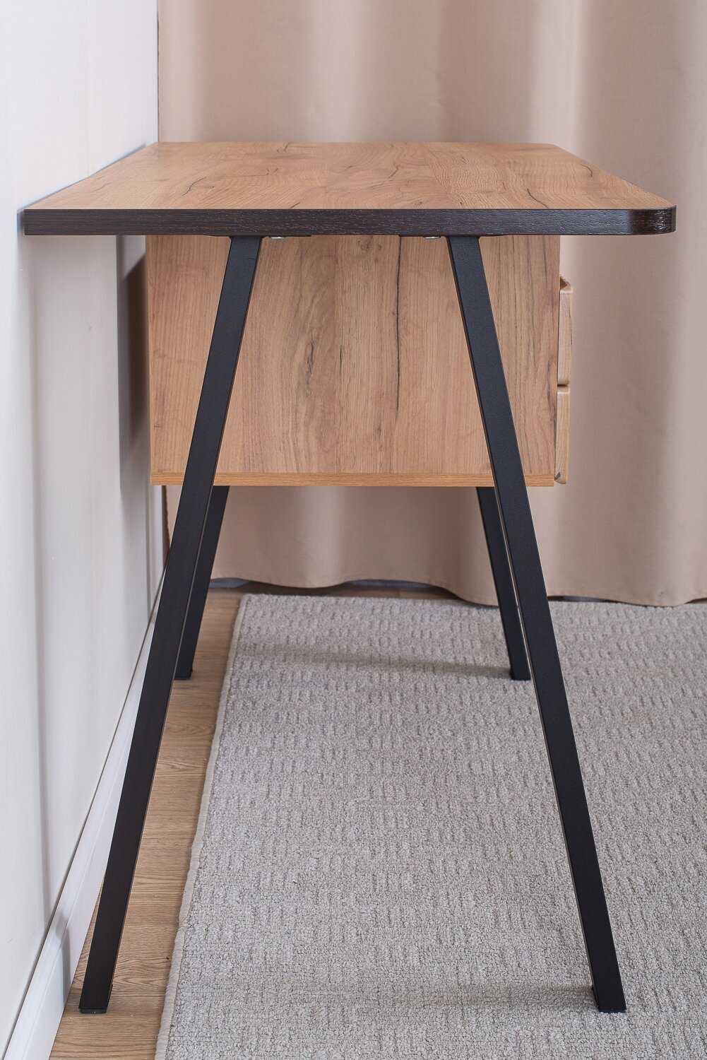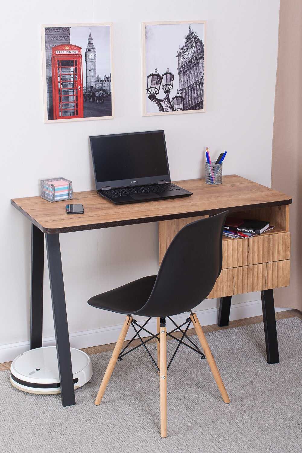 Функциональность и эргономика: Стол проектировался с четким пониманием потребностей пользователя: он предлагает просторную и широкую рабочую поверхность, обеспечивающую комфортную посадку, а также интегрированные системы хранения. В конструкцию входят выдвижные ящики и полка для хранения канцелярских принадлежностей и бумаг, что делает его организационно завершенным и предельно удобным для работы или учебы. Его компактность при общей вместительности отмечается как ключевое преимущество для размещения в ограниченном пространстве, например, в детской комнате для школьника. Закругленные торцы столешницы добавляют не только эстетики, но и практической безопасности, исключая риск получения травм. Конкретная модель с угловым примыканием и специальными стойками была выбрана пользователем осознанно, как альтернатива лофт-столам с нижней горизонтальной металлической перекладиной, которая создает помехи для работы роботов-пылесосов.