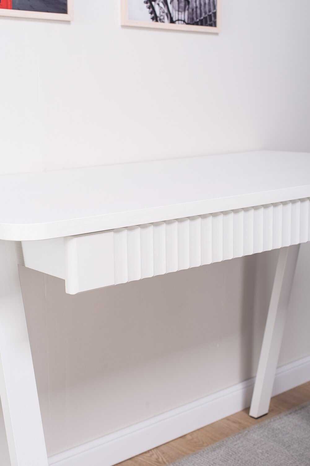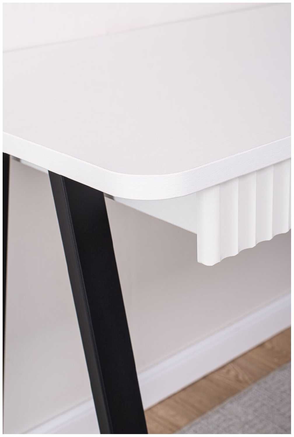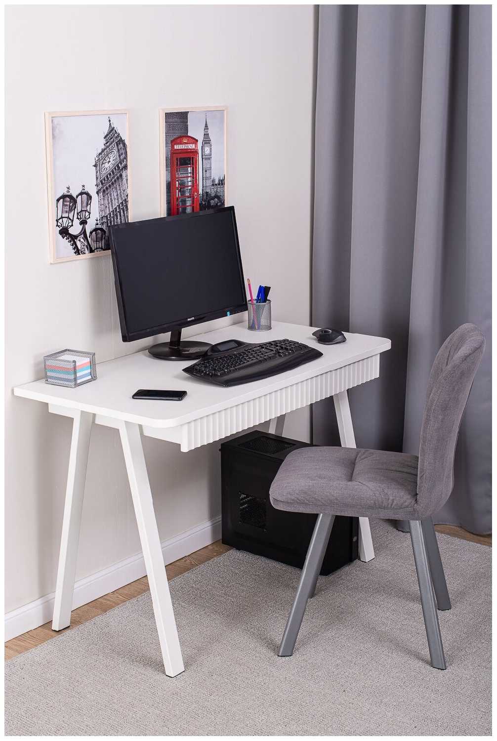 Стол отлично подходит для организации компактного рабочего места в маленькой спальне или детской комнате. Благодаря минималистичному дизайну и нейтральным цветам он легко вписывается в различные интерьеры. Его успешно используют как письменный стол для учебы и работы, а также в качестве макияжного столика. Отсутствие нижней перекладины позволяет плотно придвинуть его к стене даже при наличии высокого плинтуса.