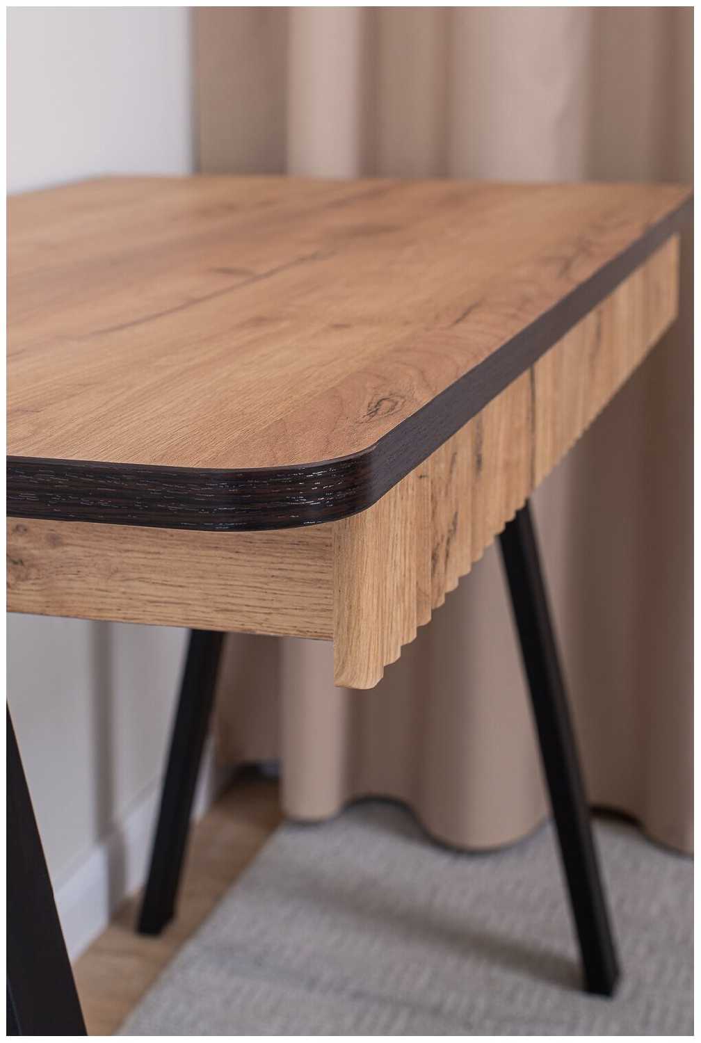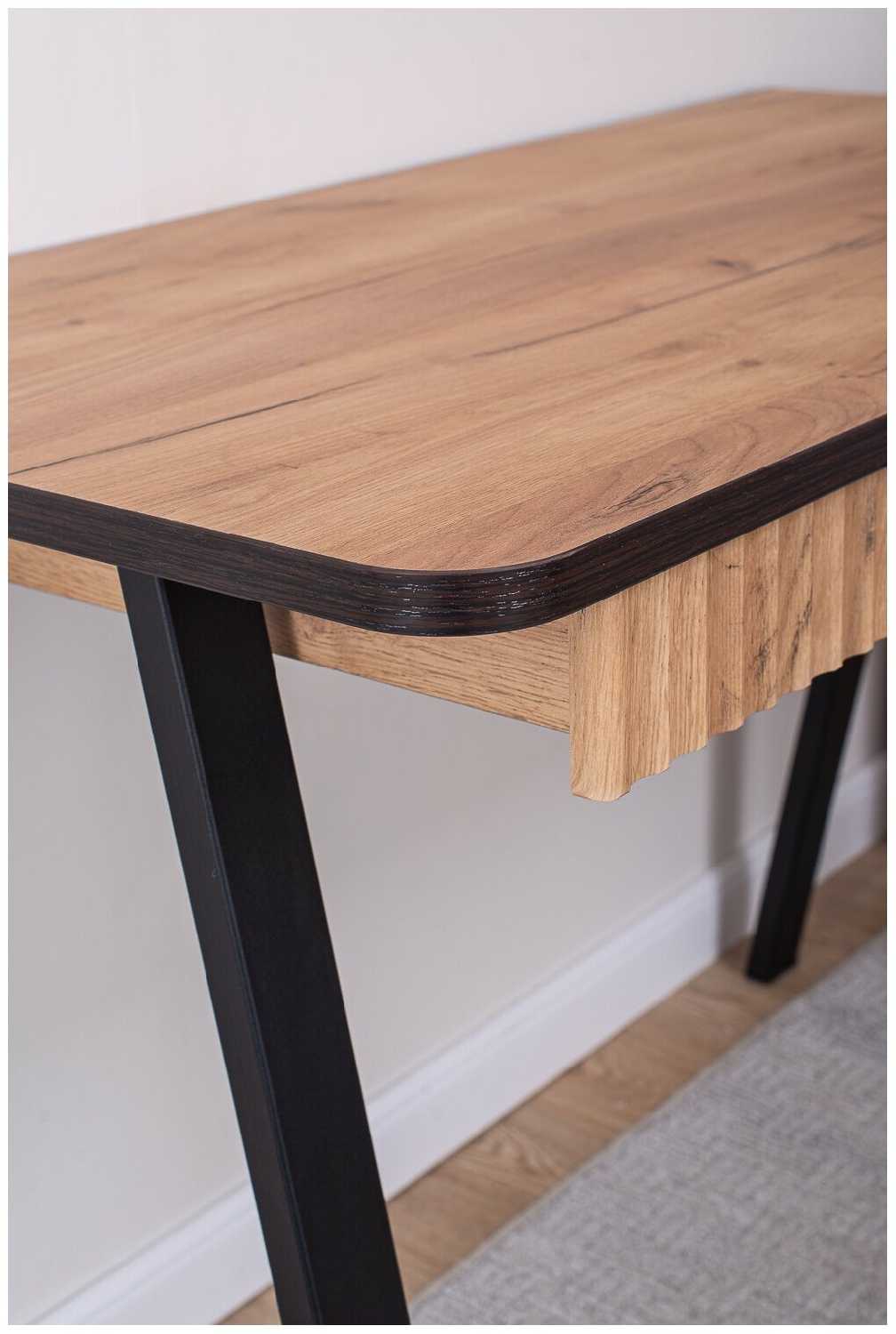 Конструкция стола демонстрирует неоднородное качество производства, что является его ключевой характеристикой. Металлические ножки часто получают положительные оценки за устойчивость и хорошее покрытие краской, однако многие пользователи отмечают наличие не зачищенных сварных швов, что свидетельствует о недостаточном контроле на финальной стадии производства. Столешница из ЛДСП в целом оценивается как приятная на ощупь, но её качество варьируется от партии к партии; встречаются сообщения о рыхлой структуре материала, локальных дефектах в виде сколов, а в некоторых случаях — о попытках замазать брак на поверхности перед отправкой покупателю. Процесс сборки в большинстве случаев описывается как простой и логичный благодаря подробной инструкции и предварительно просверленным отверстиям, однако критически важным моментом является аккуратность при работе с крепежом для ящика, так как саморезы могут быть длинноваты и при неверном угле вкручивания способны повредить переднюю панель. Кромка столешницы в целом обработана качественно, с закруглёнными углами, что повышает безопасность и эстетику, но изредка встречаются сообщения о её отслоении. Общая оценка сборки варьируется от «легко собрала за 20 минут» до проблем, связанных с ошибками в комплектации или инструкции.