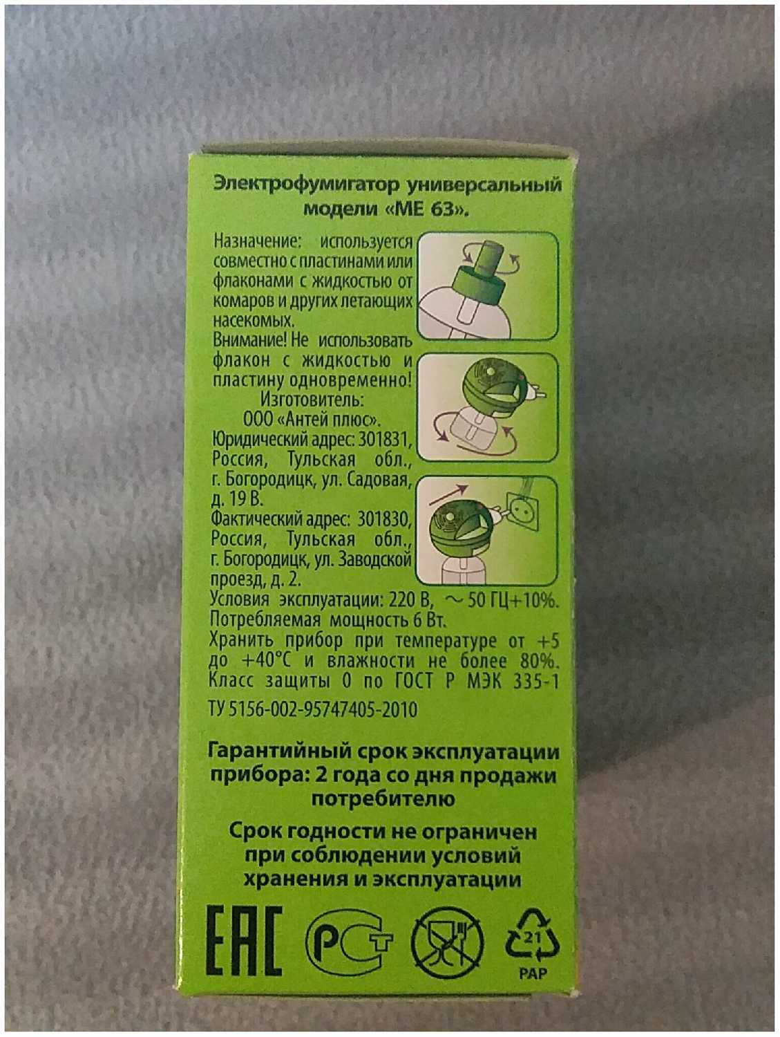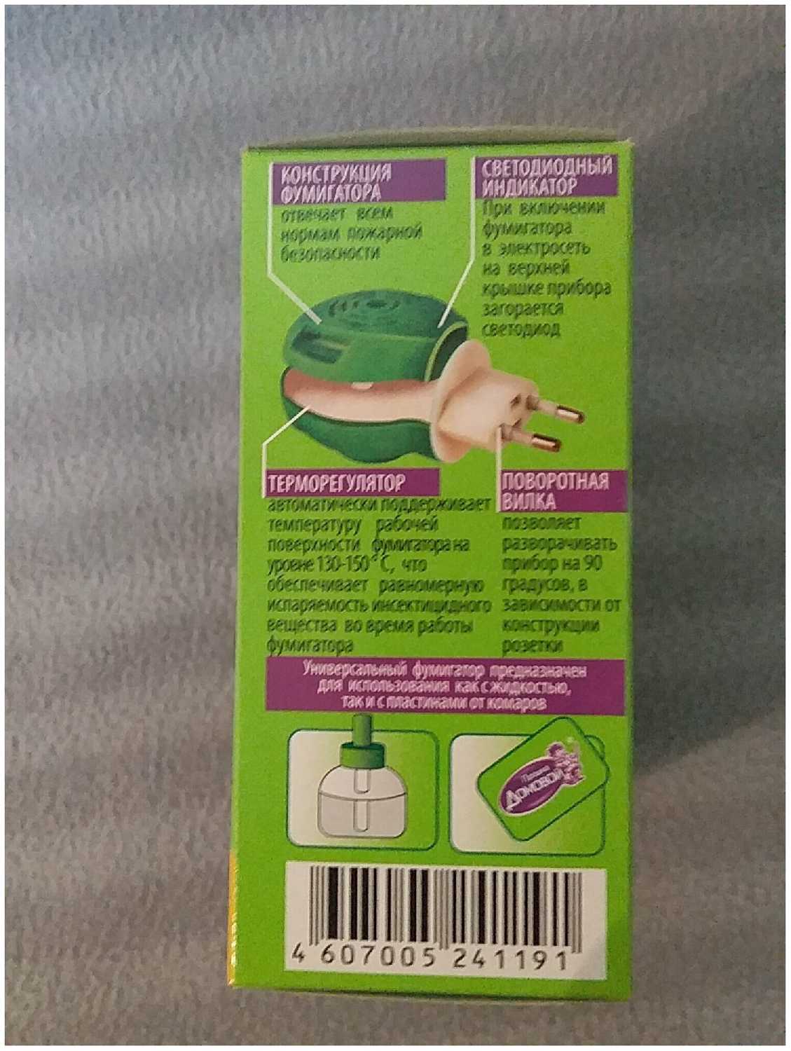 | Способ применения : | вскрыть упаковку достать электрофумигатор и флакон с жидкостью, снять защитный колпачок ввернуть флакон в нагреватель до упора, включить фумигатор в электросеть 220В флакон при этом должен находиться в вертикальном положении |