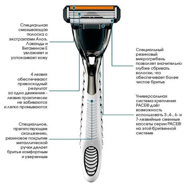 - Дизайн ручки позволяет легко маневрировать бритвой в зонах сложного контура (шея, линия подбородка).