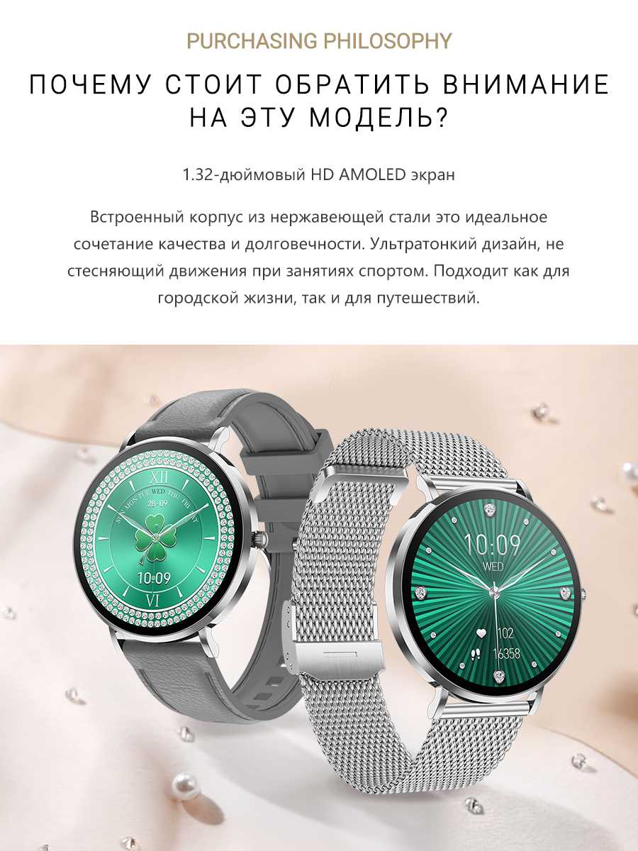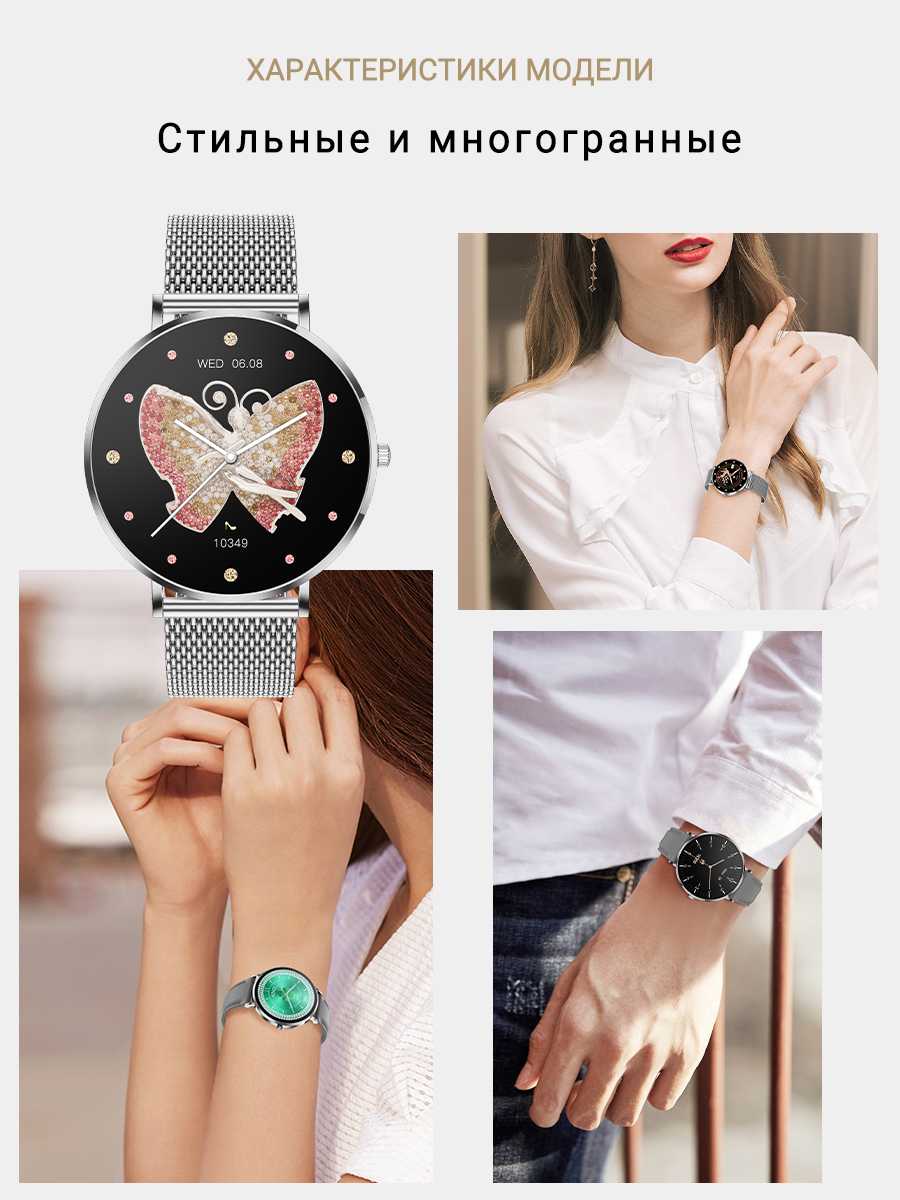 Часы легкие, тонкие, удобно сидят на руке, подходят даже на худые запястья. Дизайн стильный, с AMOLED-экраном и олеофобным покрытием; металлический браслет выглядит благородно у большинства. В комплекте два ремешка — силиконовый и миланская петля. Однако цвет металла некоторым кажется дешевым, а перестановка ремешка сложная — застежки выпадают. Подходят для повседневного ношения и как подарок.