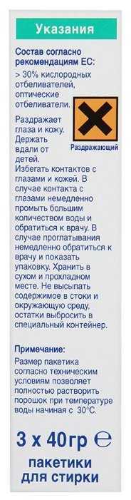 | Способ применения : | добавьте 1/2 часть пакетика в дозатор стиральной машины независимо от температуры и жесткости воды и стирайте как обычно, не используйте программу быстрой стирки |
