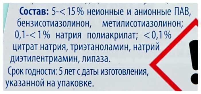 | Состав : | 5% анионные тензиды, метилхлороизотиацолины |