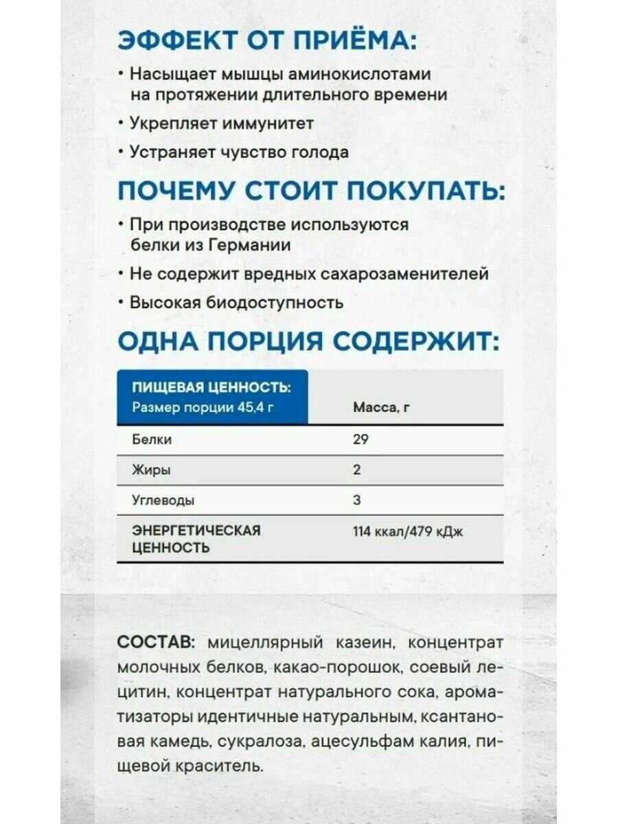 Дополнительная информация : | состав: мицеллярный казеин, концентрат молочных белков, какао-порошок, соевый лецитин, концентрат натурального сока, ароматизаторы идентичные натуральным, ксантановая камедь, сукралоза, ацесульфам калия, пищевой краситель |