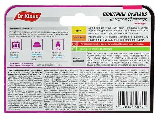Дополнительная информация : | Dr.Klaus эффективно и безопасно защищает ваши вещи от моли и её личинок. Просто извлеките пластины из упаковки и разместите в шкафу не менее 10 пластин, в зависимости от его размера. Для защиты вещей в ящиках используйте 3-5 пластин. Для защиты обуви или вещей в коробках – 1 пластину. Через 6 месяцев пластины следует заменить. Важно! Главной фактором порчи мебели и вещей является не взрослая особь, а именно гусеница моли. |