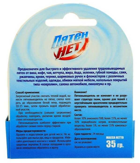 | Способ применения : | загрязненный участок смочить теплой водой, нанести пятновыводитель на пятно, слегка потереть до образования белой пены, подождать 10-15 минут, затем промыть водой обработанный участок |