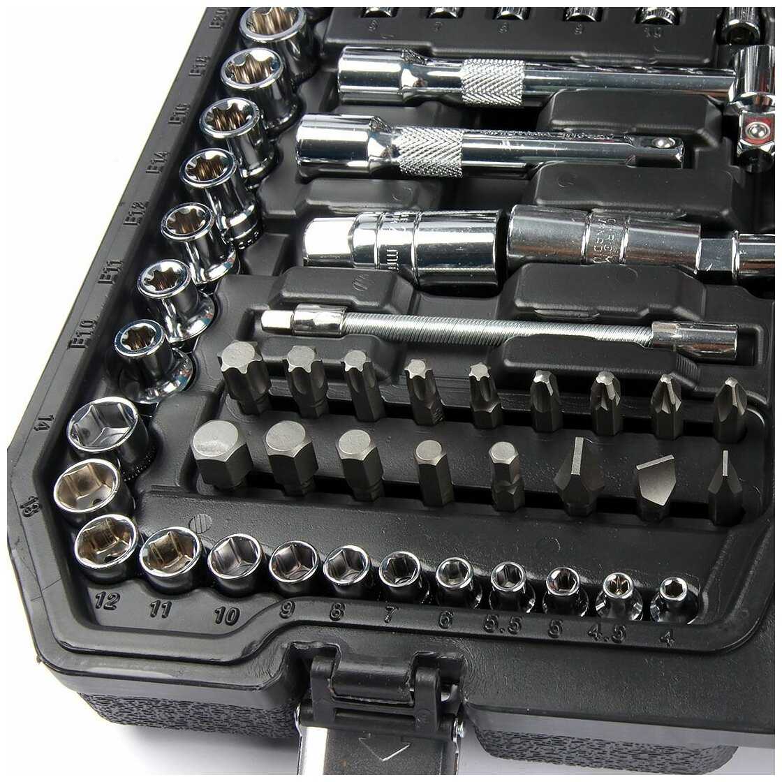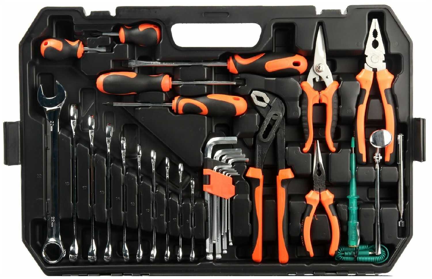 | Инструменты в комплекте : | вороток для головок, длинногубцы, клещи, клещи переставные, ключи гаечные, ключи имбусовые (шестигранные), отвёртки, пассатижи, рукоять для головок, трещотка |