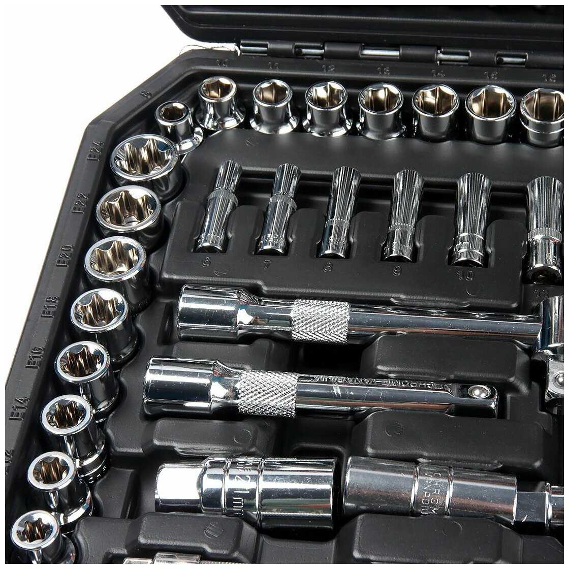 | Головки торцевые подробно : | - метрические шестигранные торцевые головки посадочный размер 1/2: 8 10 11 12 13 14 15 16 17 18 19 20 21 22 24 27 30 32, - метрические шестигранные торцевые головки посадочный размер 1/4: 4 4.5 5 5.5 6 7 8 9 10 11 12 13 14, - торцевые головки Е-стандарта (внутренний TORX) посадочный размер 1/4: Е4 Е5 Е6 Е7 Е8, - торцевые головки Е-стандарта (внутренний TORX) посадочный размер 1/2: Е10 Е11 Е12 Е14 Е16 Е18 Е20 Е22 Е24, - удлинённые метрические шестигранные торцевые головки посадочный размер 1/2: 14 15 17 19 22, - удлинённые метрические шестигранные торцевые головки посадочный размер 1/4: 6 7 8 9 10 11 12 13, - свечная головка посадочный размер 1/2: 16 21, - свечная головка посадочный размер 3/8: 14 |