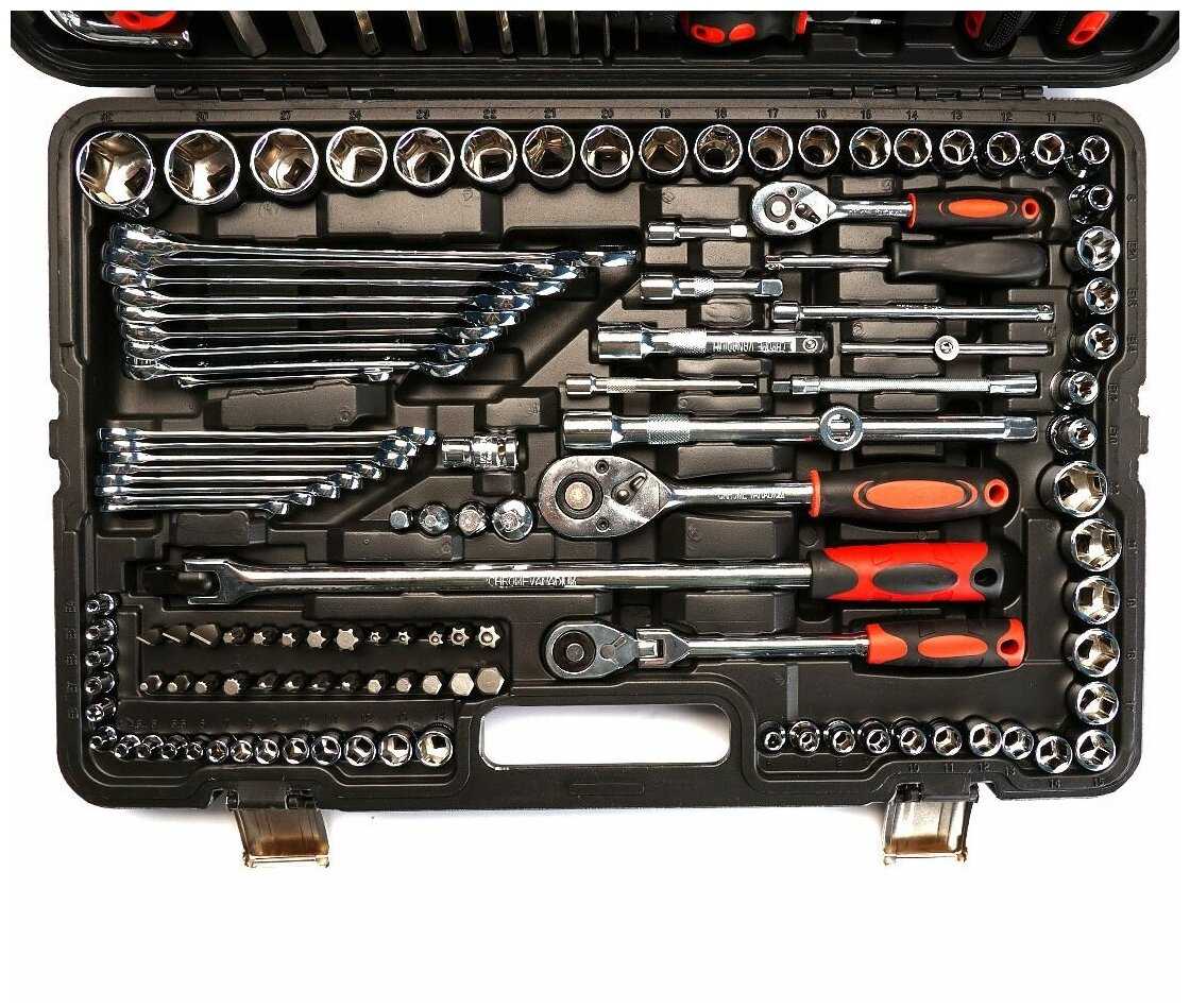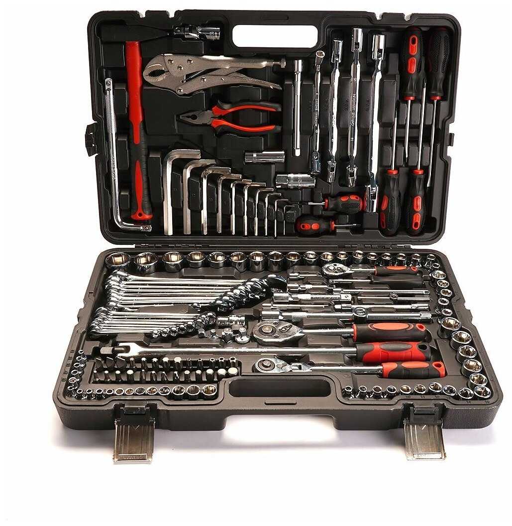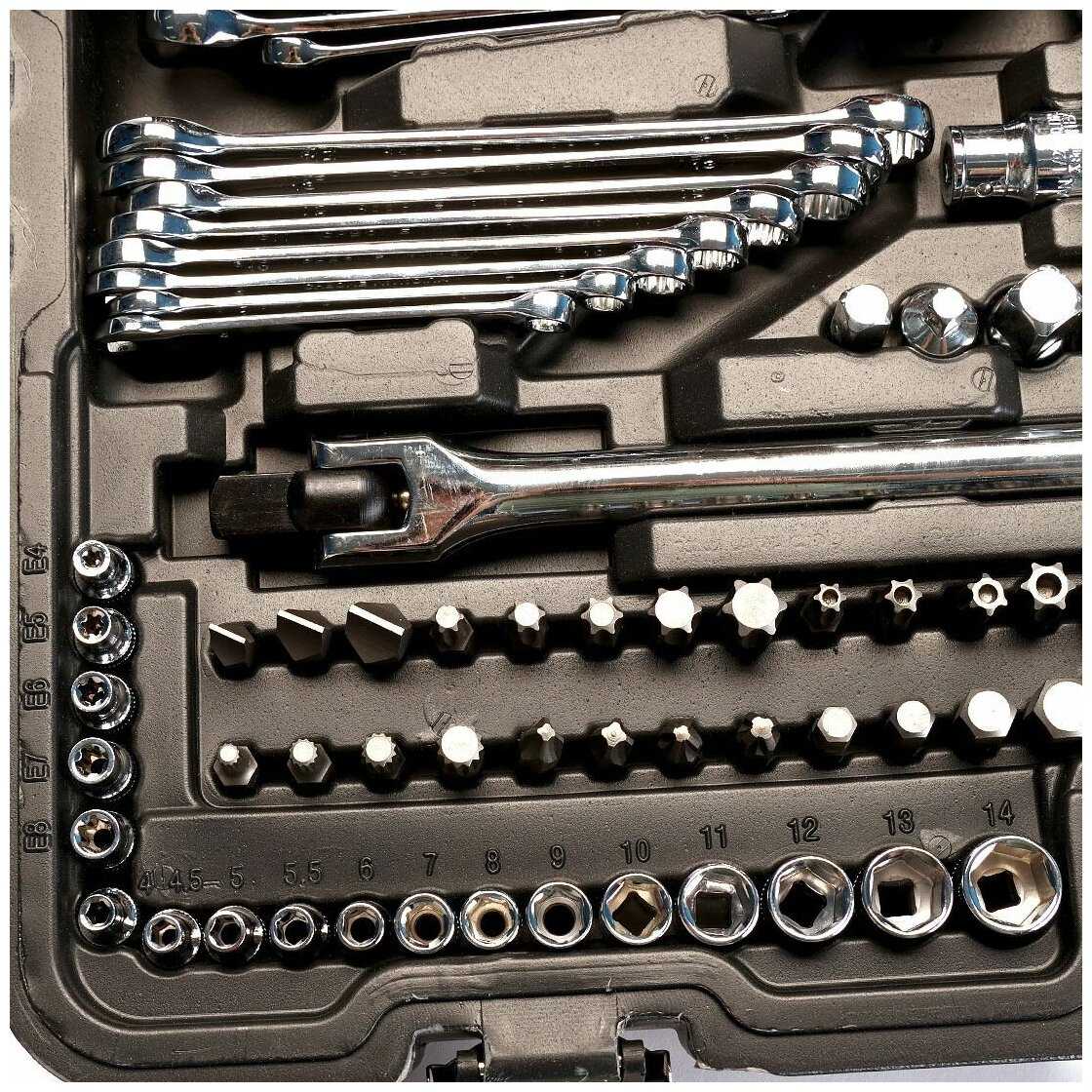 | Инструменты в комплекте : | бородок, вороток для головок, клещи, клещи переставные, ключи гаечные, ключи имбусовые (шестигранные), ключи торцевые, кусачки, молоток, отвёртки, пассатижи, плоскогубцы, рукоять для бит, рукоять для головок, трещотка |