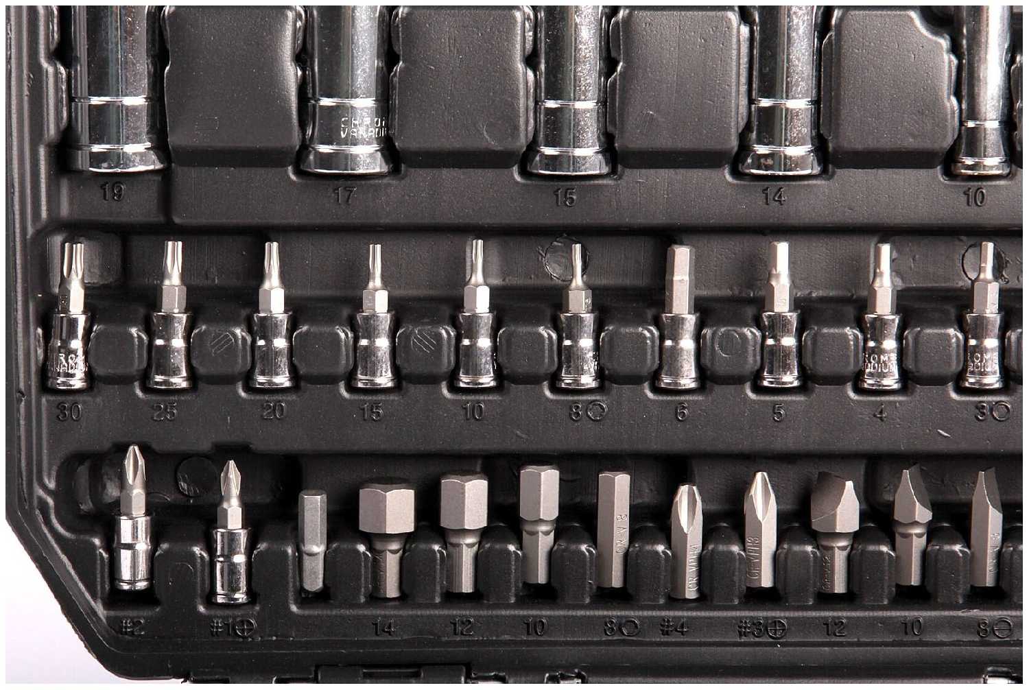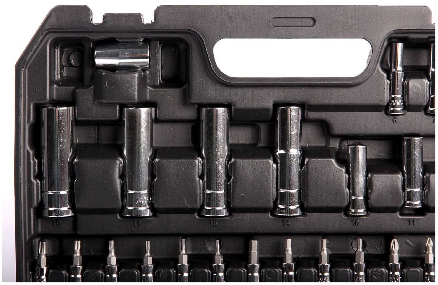 - Отделение для удлинителей и переходников упрощает поиск нужного инструмента во время ремонта.