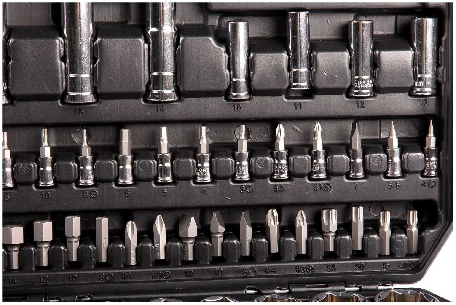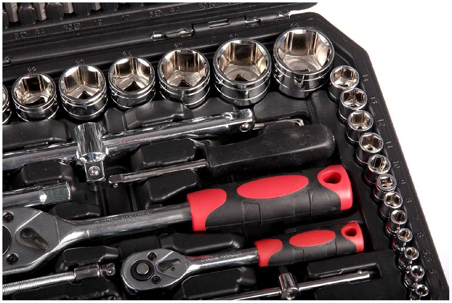 Набор инструментов представляет собой компромисс между ценой и функциональностью, ориентированный на начинающих автолюбителей и домашних мастеров. Его главное преимущество — широкая комплектация, включающая головки от 8 до 23 мм, TORX-биты и удлинители, что позволяет выполнять 90% типовых задач по обслуживанию автомобилей ВАЗ или ремонту бытовой техники. Удобный кейс с продуманным (хоть и не идеальным) размещением инструментов делает набор мобильным — его можно хранить в багажнике или переносить по мастерской. Однако низкое качество металла ограничивает применение: головки деформируются при нагрузках свыше 30–40 Н·м, что критично для профессионального использования.