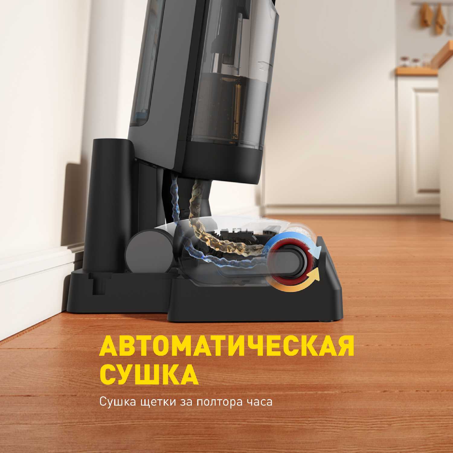 - Автоматически моет себя после уборки за 1 минуту, сушит ролик за 20–30 минут с минимальным шумом.