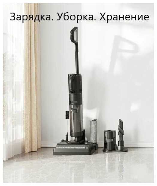 Маневренный за счет самохода вперед, требует лишь направления кистью без нагрузки на руку после привыкания, с вертикальной парковкой без базы и низким шумом (кошки наблюдают, не убегают). Съемный ручной модуль залезает в щели, машину и мебель, докупкой турбощетки/трубы превращается в полноценный пылесос для шерсти, дешевле Dreame V9. Русифицирован с голосовым ассистентом (оповещения о баках, режимах), обслуживание интуитивно — вылить/промыть баки под краном без мокрых рук, защелки прочные. Тяжелее ведра с водой, но устойчив, комплект богат (запасной валик, фильтр, средство), насадки хранятся на базе.