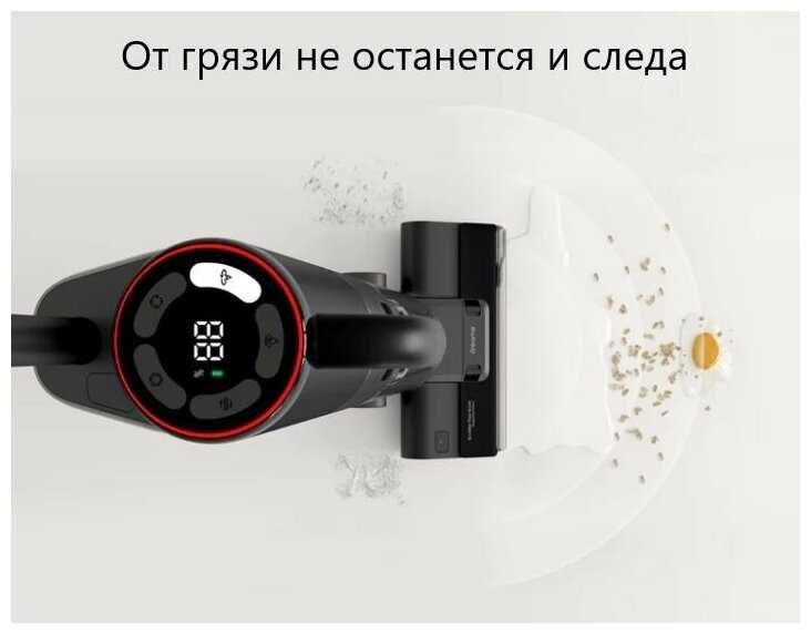 Пылесос обеспечивает мощное всасывание 23000 Па для твердых покрытий (ламинат, плитка, кафель), собирая пыль, шерсть, разлитые жидкости и крупный мусор за 1-2 прохода, оставляя полы слегка влажными без разводов. В автоматическом режиме самостоятельно активирует турбо на загрязненных зонах, эффективно отмывая въевшуюся грязь, как отмечают владельцы с животными и детьми — черная вода в баке после первой уборки поражает даже при регулярном мытье. Роликовый валик не наматывает волосы, но скатывает их в комки на коврах с низким ворсом, где сухая уборка работает приемлемо, хотя крупный мусор (соль) иногда вываливается из ручного модуля. Зазор 3-4 мм у плинтуса с одной стороны требует ручной доработки тряпкой раз в неделю, а под кровать/диван не заезжает из-за ограничения наклона 45°. Сухая уборка ковров возможна, но не для длинного ворса, где уступает проводным моделям.