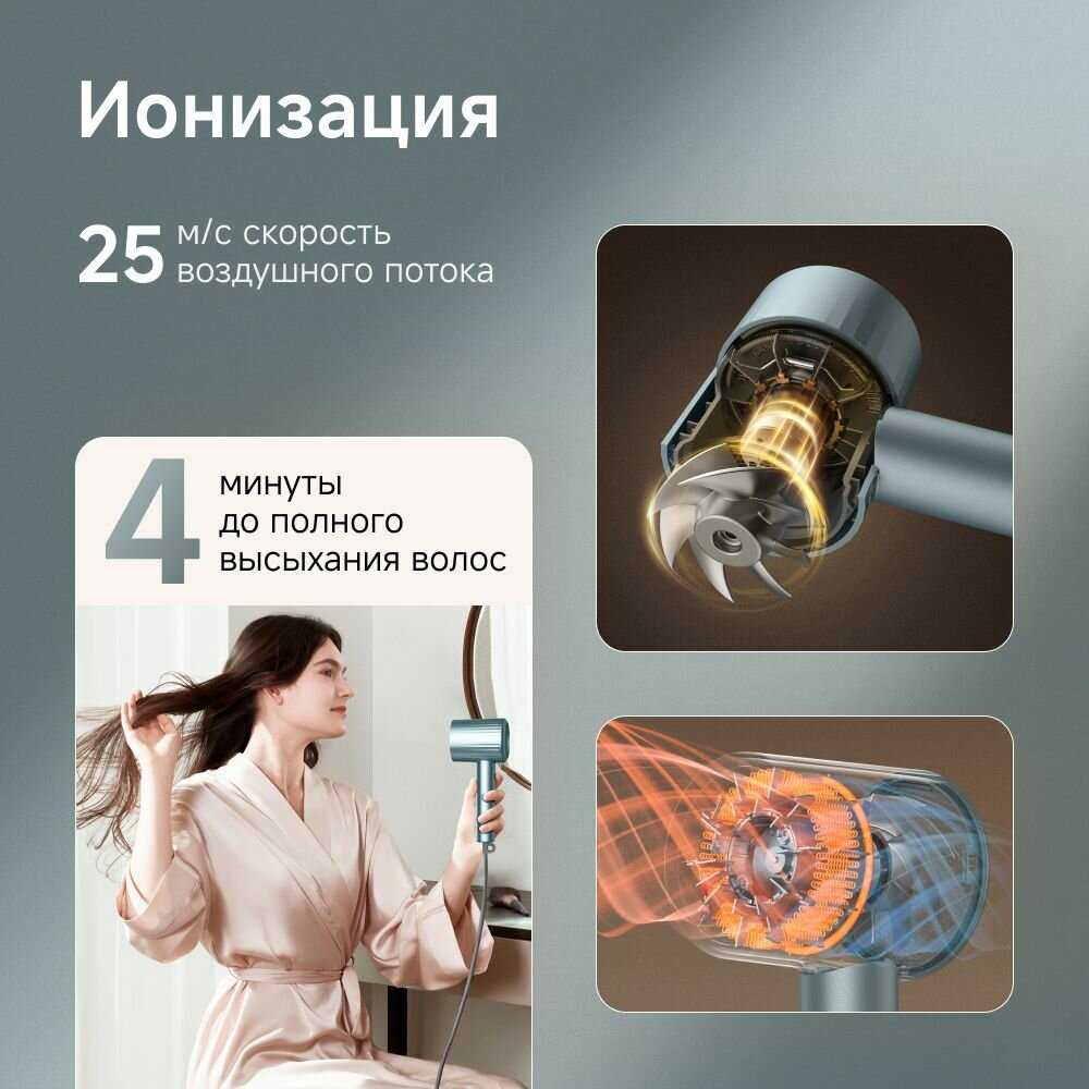 Большинство пользователей отмечают, что фен высушивает волосы до поясницы за 5–10 минут благодаря мощному потоку воздуха. Для средней длины достаточно 2–3 минут. Скорость зависит от густоты и исходной влажности, но даже обладательницы плотных кудрей подтверждают эффективность. -