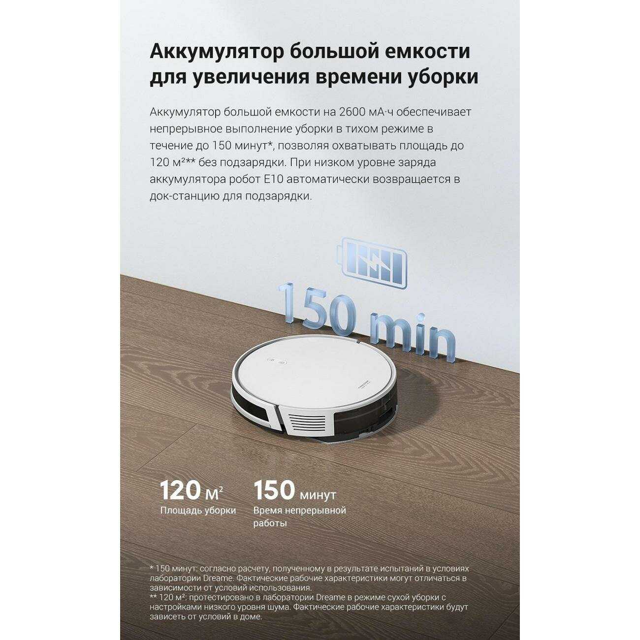 - Автоматически едет на зарядку при 15% и возобновляет уборку, минимизируя простои в домах до 75 кв.м.