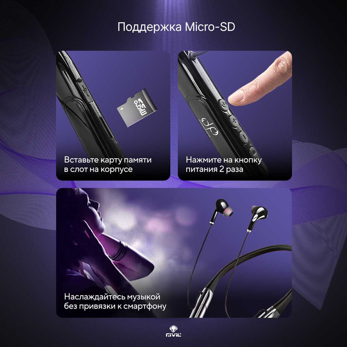 - Возможность проигрывать музыку напрямую с карты памяти без использования Bluetooth, что экономит заряд батареи.