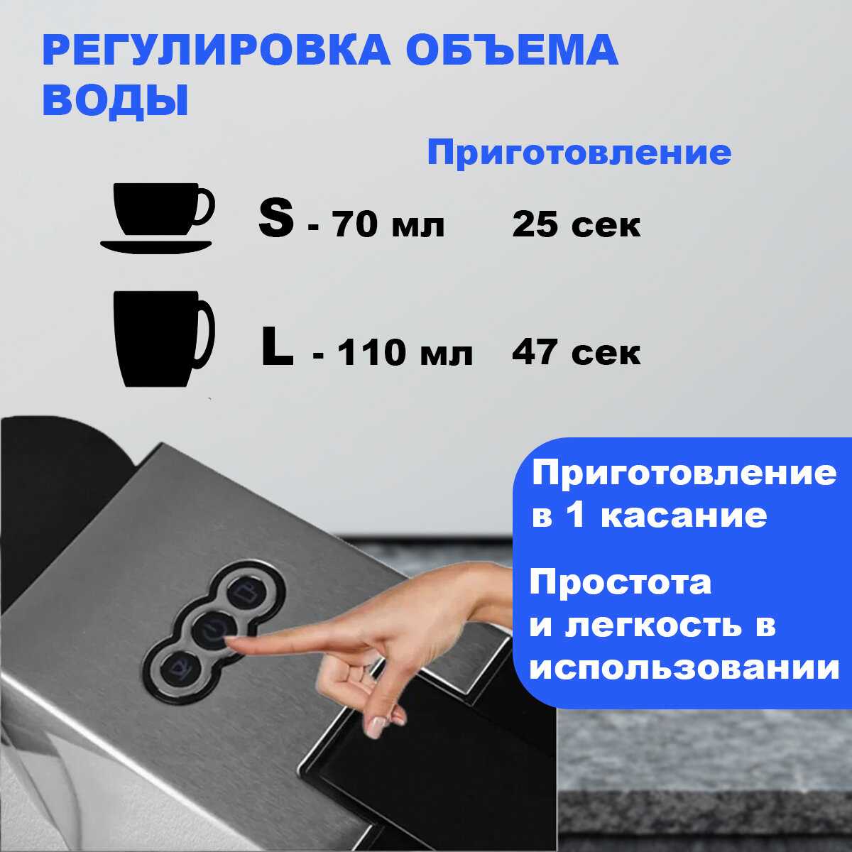 Резервуар маленький из-за компактных габаритов, подходит для 1-2 чашек. Иногда не встает плотно с первого раза, что приводит к лужам на столе. Пользователи советуют проверять фиксацию. Продолжают наблюдение без серьезных проблем. -