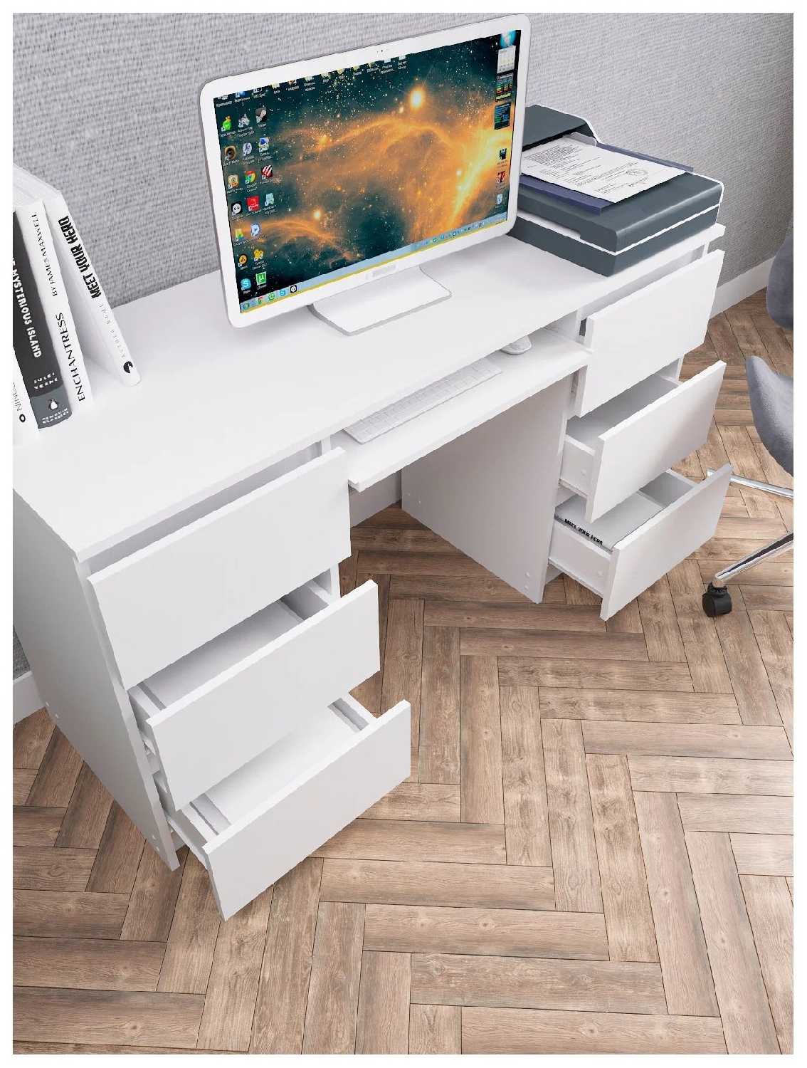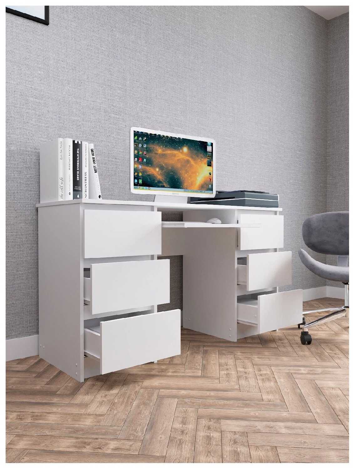 Отличный стол. Не большой, удобный с выдвижными ящиками. Все очень компактно и стильно