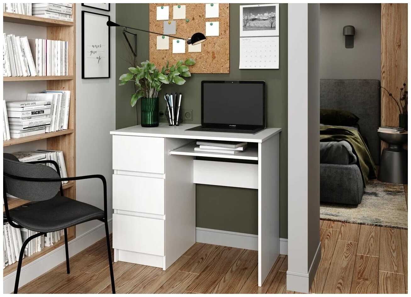- + белый, небольшой, ящики и отдельная выдвижная полка под клавиатуру
