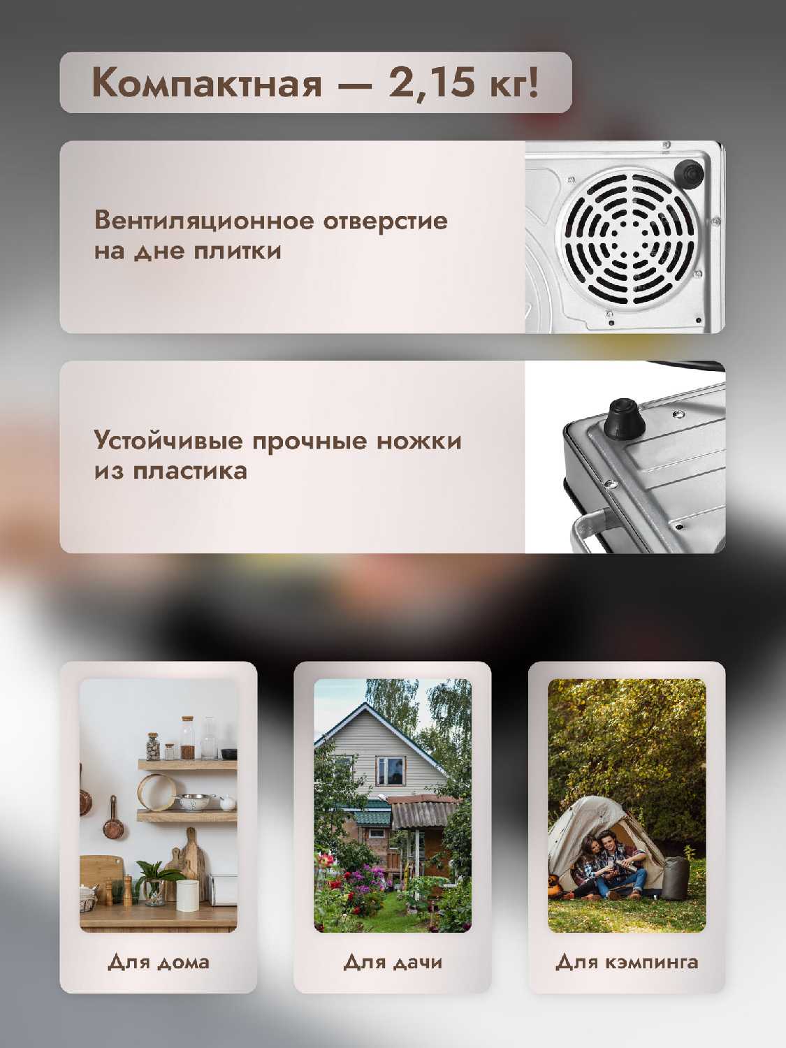 Гладкость стекла керамическая поверхность легко очищается от загрязнений. Даже при проливания пищи достаточно протереть её влажной тряпкой. Настольная плита занимает немного места что делает её идеальным вариантом для малогабаритных кухонь или для использования на даче