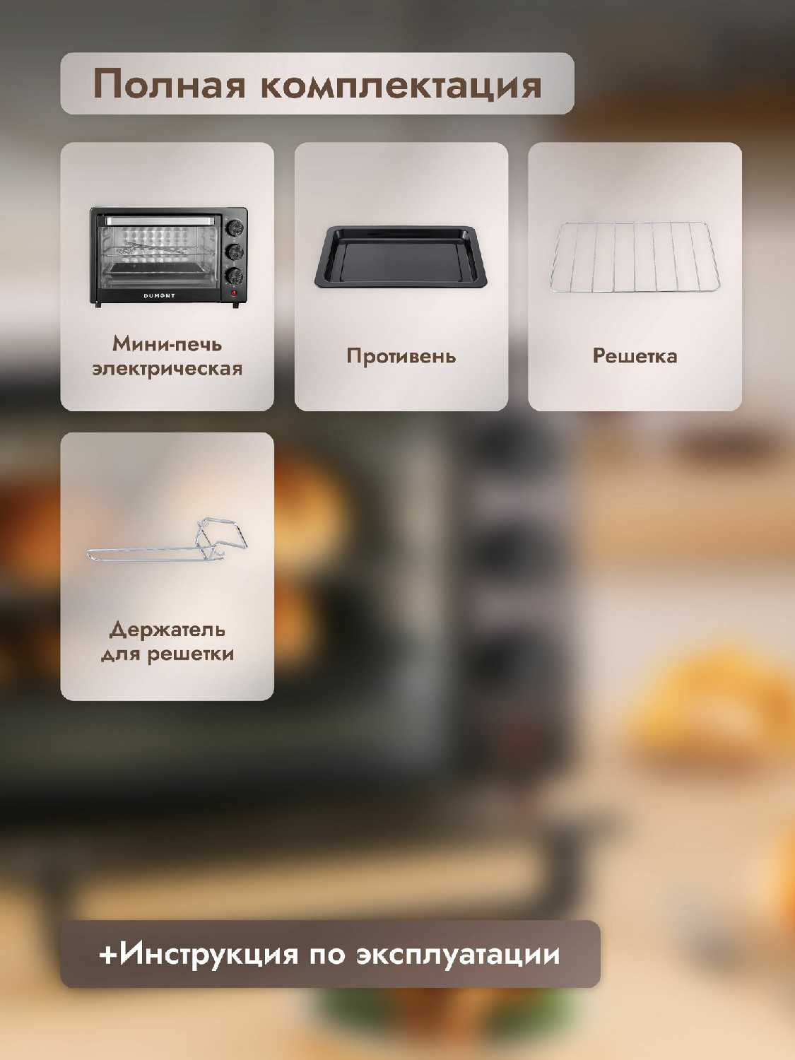 Дополнительная информация : | комплектация: мини-печь, противень, решетка, держатель для решетки, инструкция |