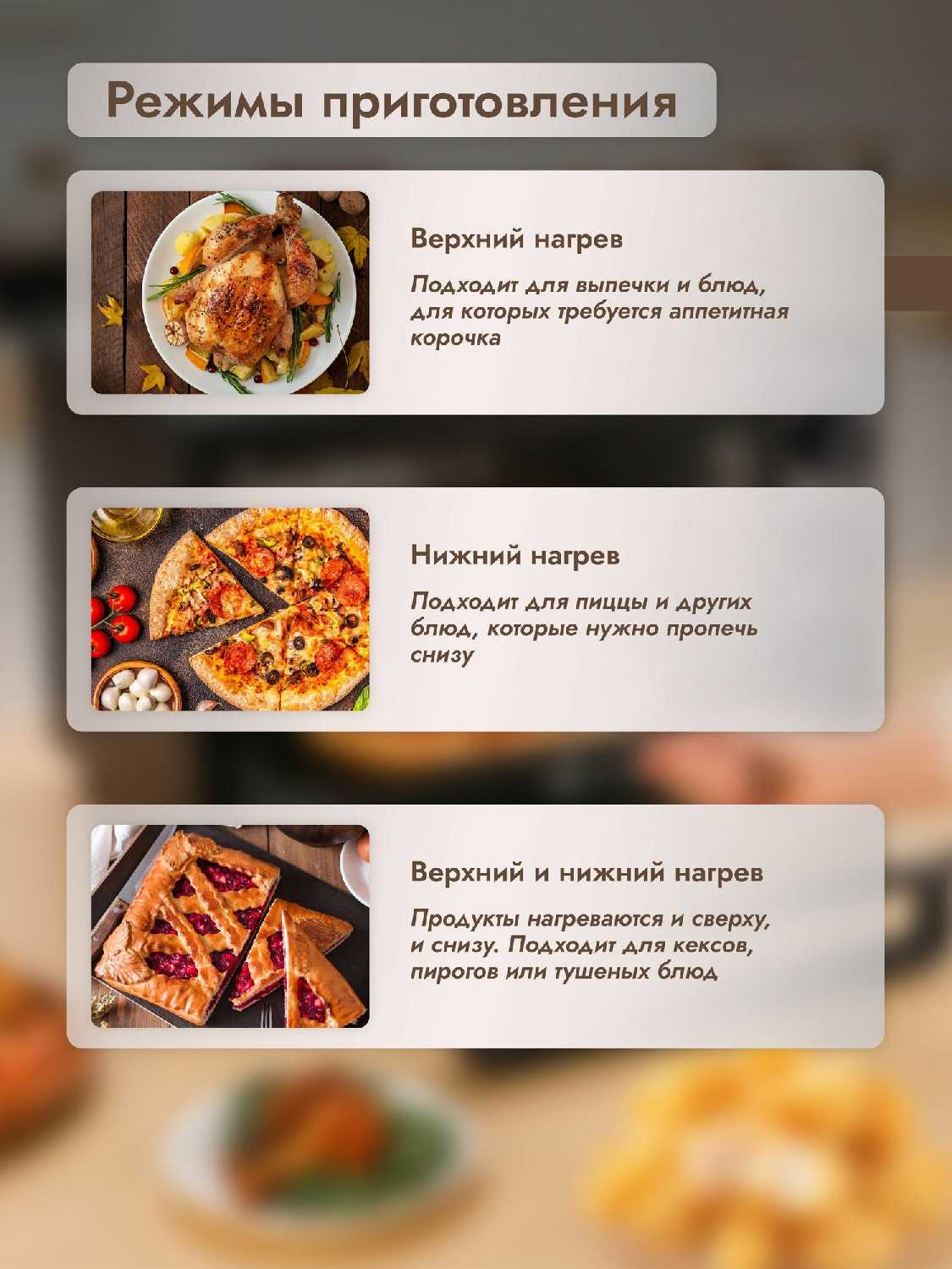Режимы работы : | верхний нагрев, верхний+нижний нагрев, нижний нагрев, поддержание температуры |