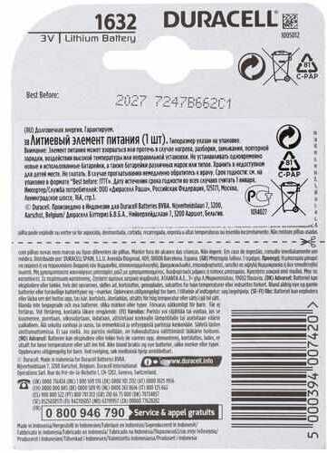 Дополнительная информация : | Батарейка литиевая Duracell CR1632 |