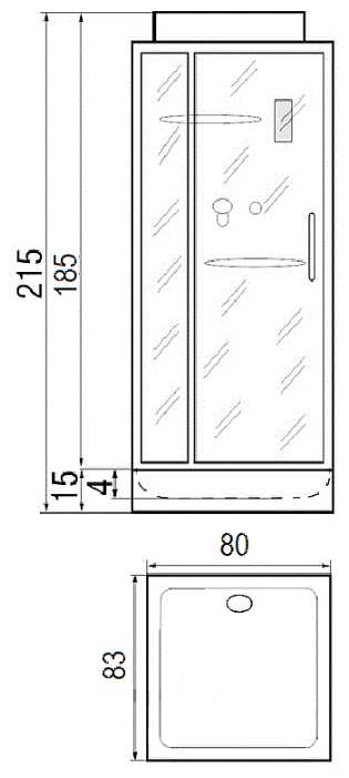 - + Верхний и ручной душ, раздвижные двери, две полочки.