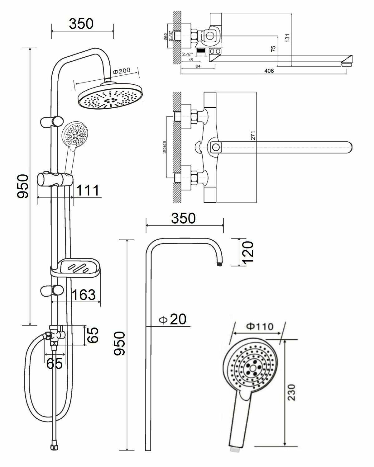 - регулируемый верхний душ
