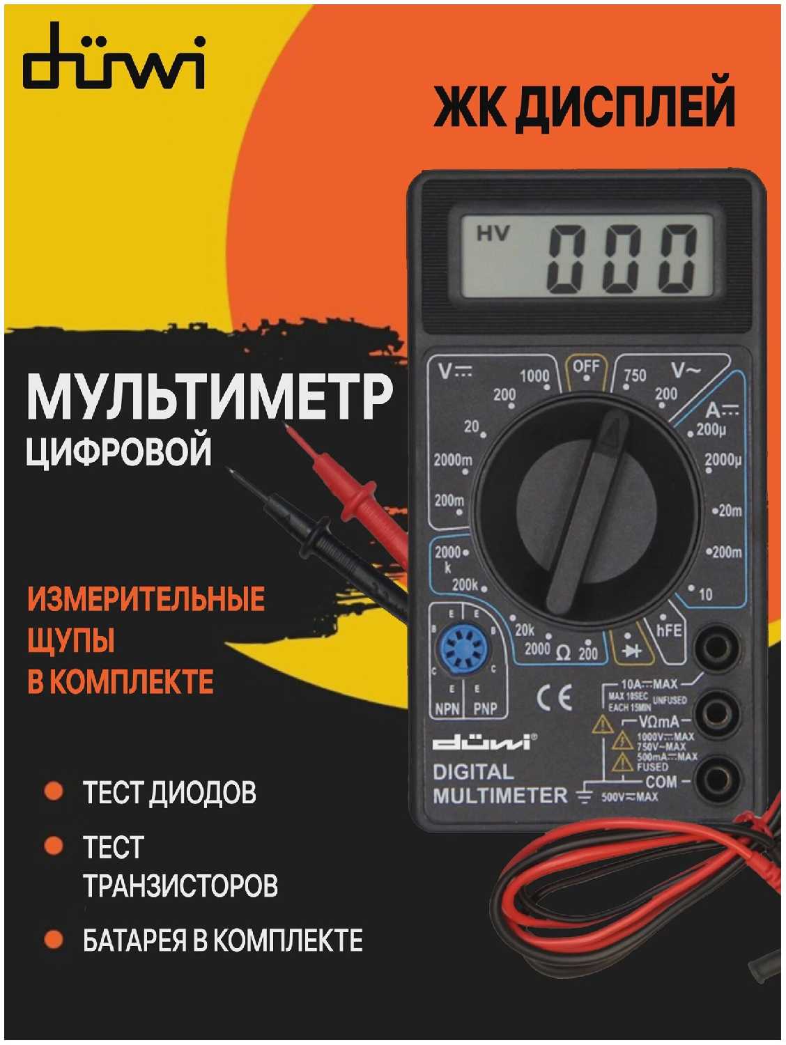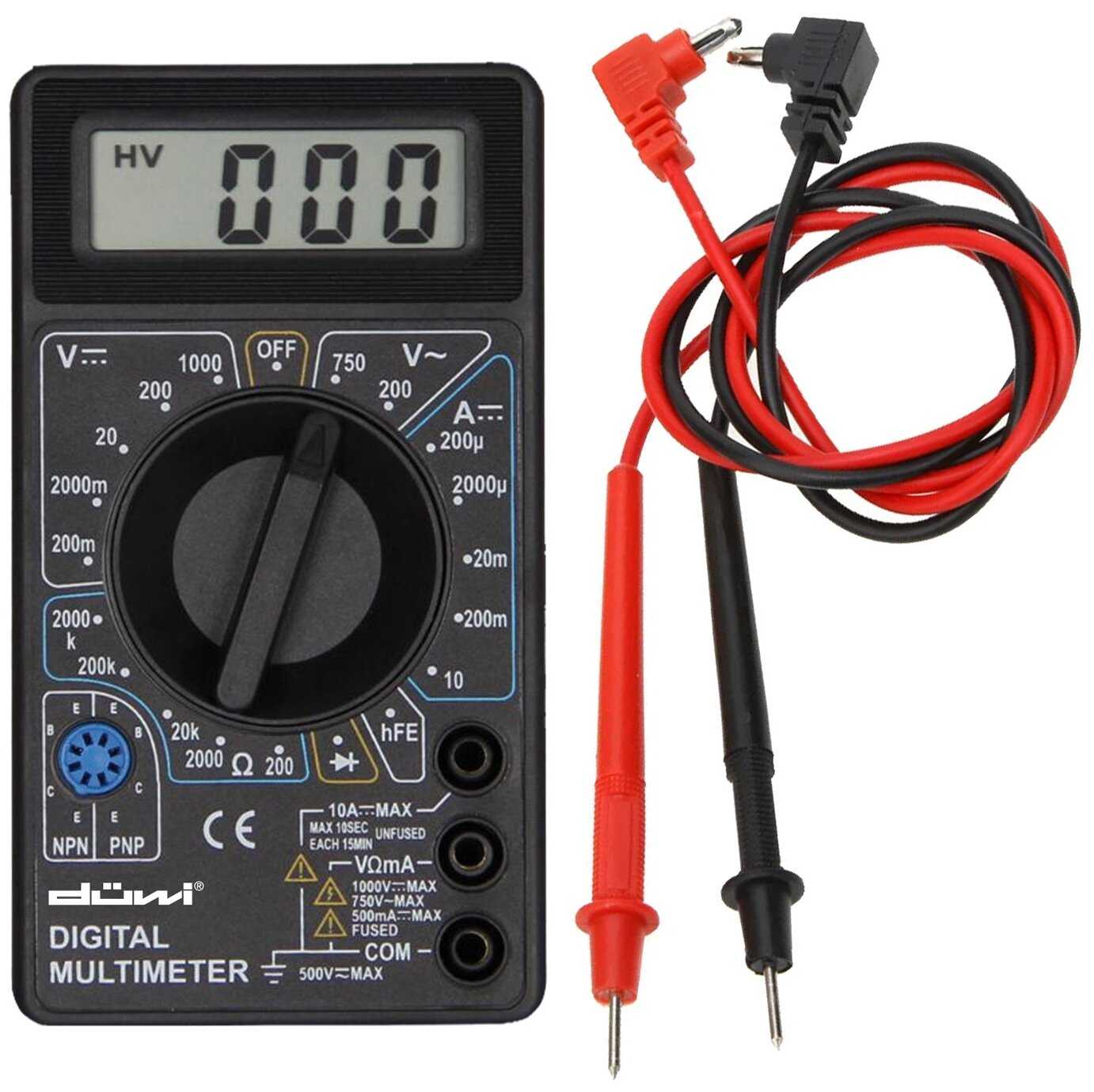 | Функции : | измерение емкости конденсаторов, измерение переменного напряжения, измерение постоянного напряжения, измерение работоспособности диодов и транзисторов, измерение силы переменного тока, измерение силы постоянного тока, измерение сопротивления, измерение частоты |