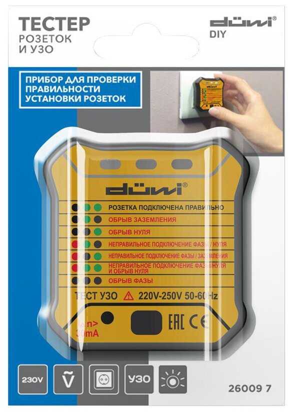 | Дополнительная информация : | для проверки правильности подключения фазы нуля заземления к электрическим розеткам, с функцией тестирования УЗО |
