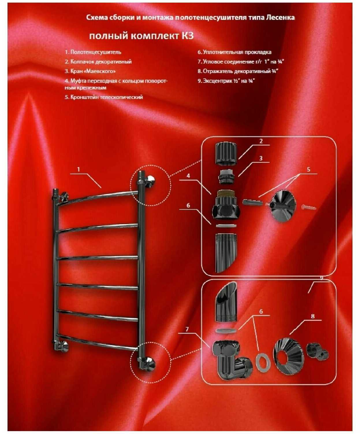 | Дополнительная информация : | Полотенцесушитель Клапан Маевского - 2 шт. Декоративный колпачок - 2 шт. Крепеж телескопический - 2 шт. Уголок гайка/гайка 1 / 3/4 - 2 шт. Отражатель глубокий 3/4 - 2 шт. Эксцентрик 3/4 / 1/2 - 2 ш |
