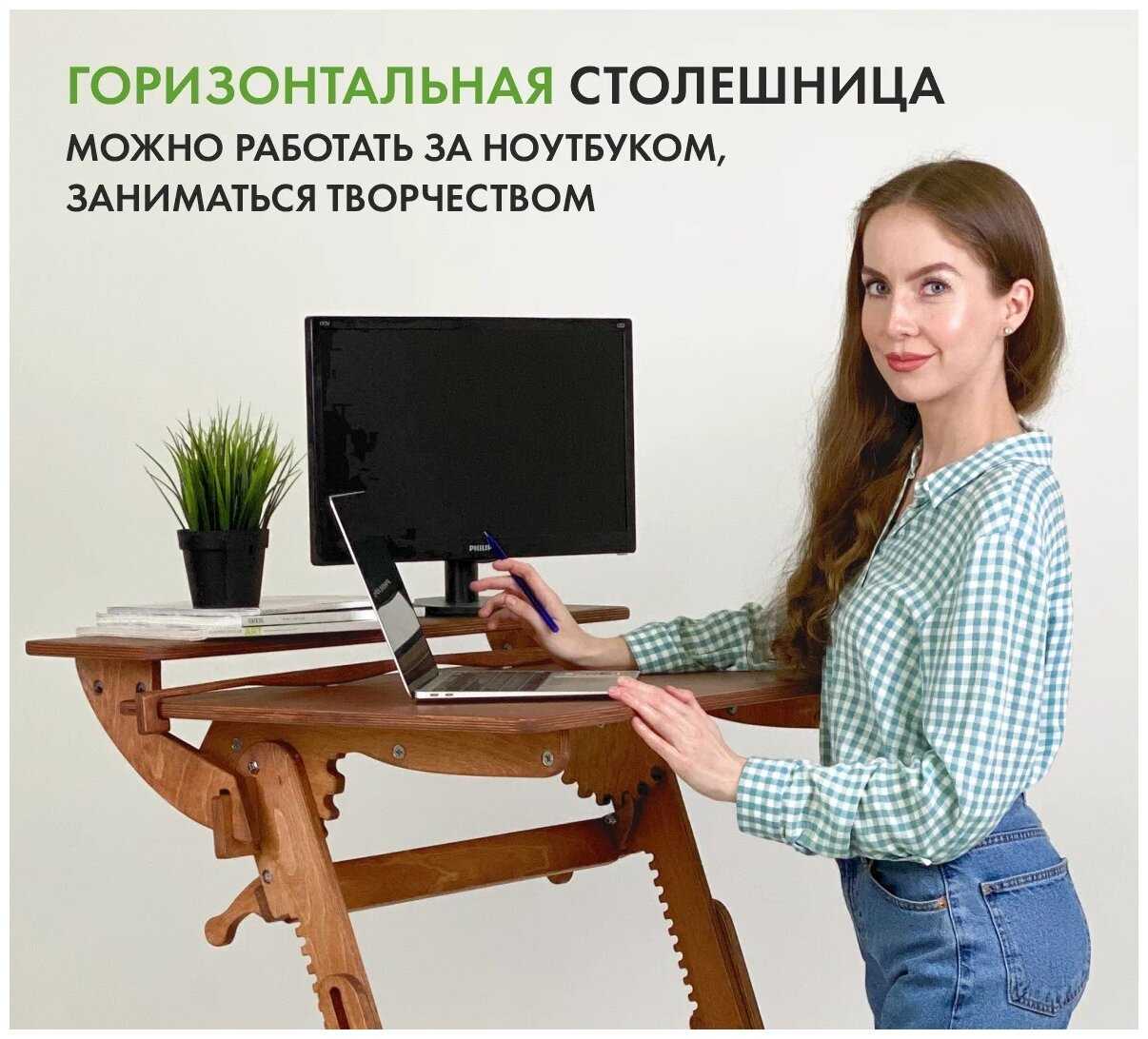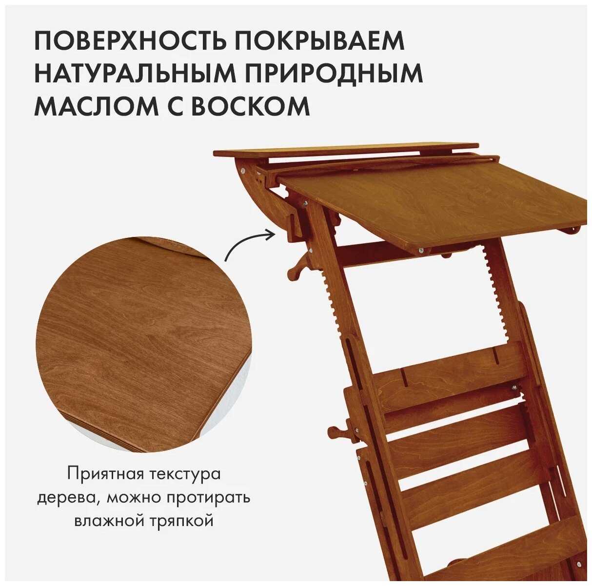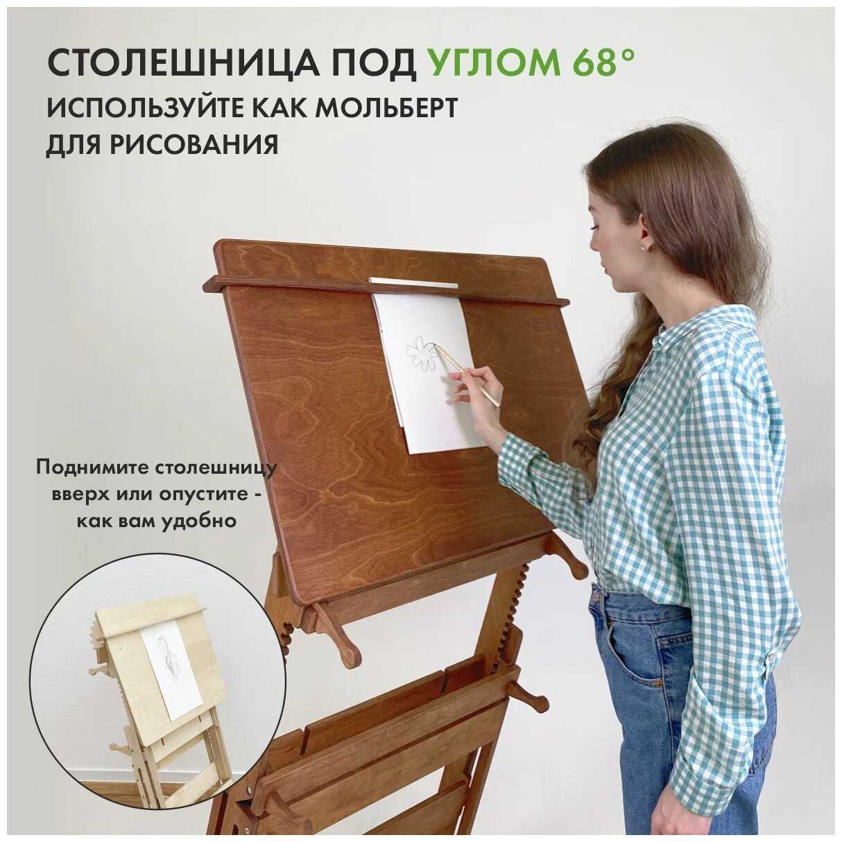 - + достаточно крепкий несмотря на забавную конструкцию из деревянных шестерёнок, можно трансформировать в мольберт, есть доп полка под монитор, собирается легко