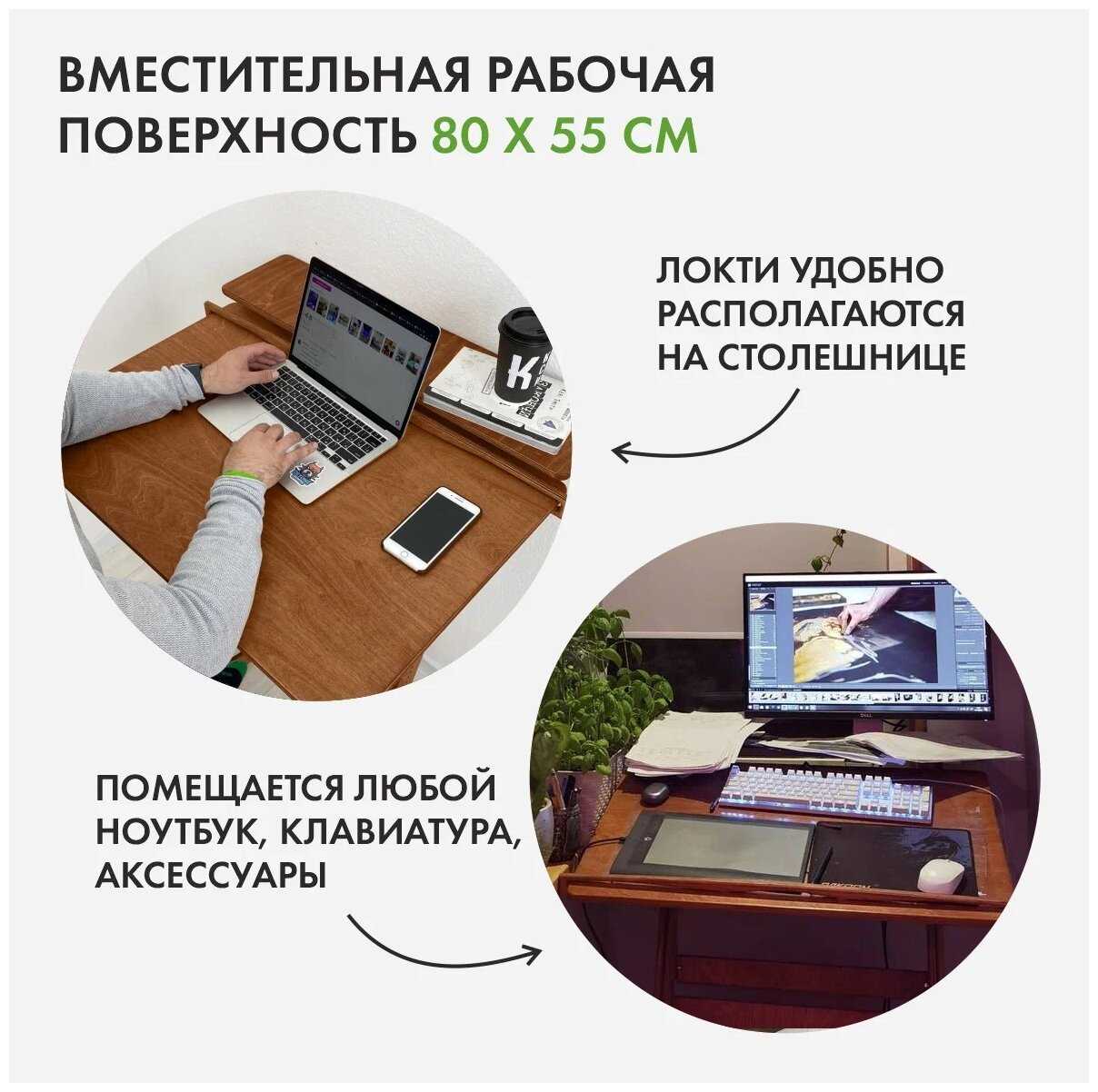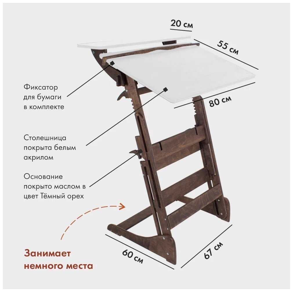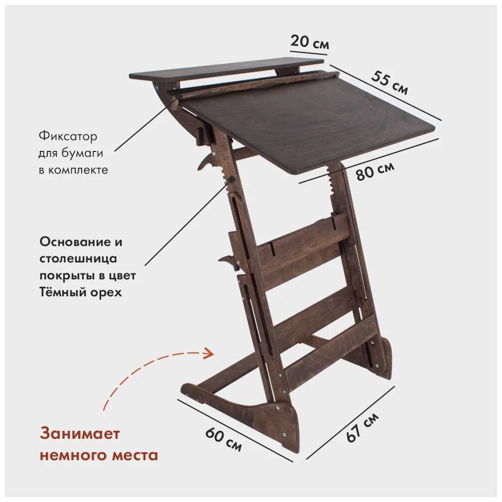 - + Можно работать за компьютером стоя, можно использовать как мольберт, несколько положений наклона столешницы